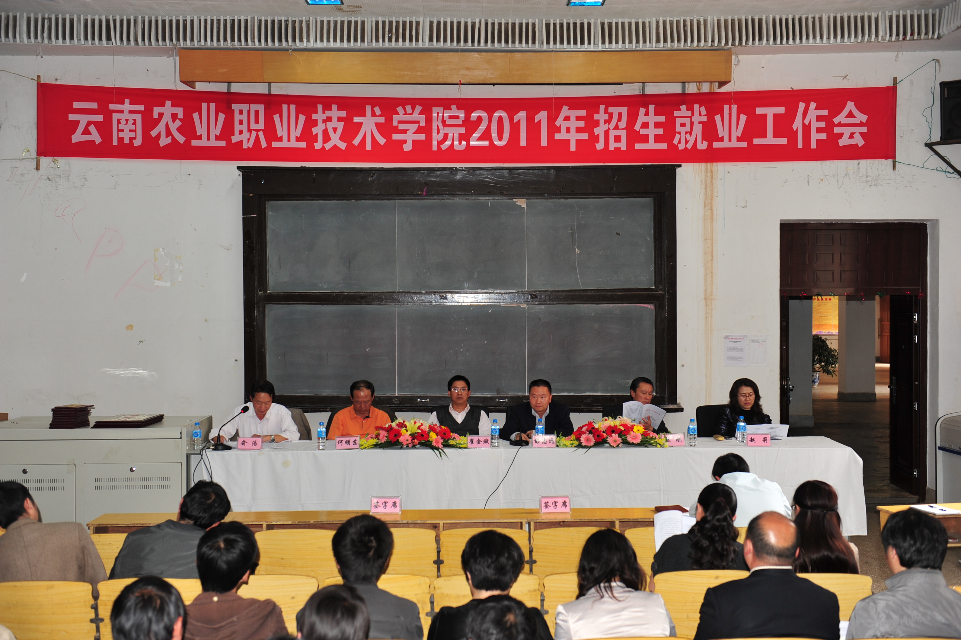 2011年5月5日下午2點半,學院在茭菱校區行政樓階梯教室隆重召開了云南農業職業技術學院2011年招生就業工作會。學院黨委書記崔金賦同志、院長彭志遠同志、趙剛副書記、何明東副院長、俞浩副院長、趙莉副院長出席此次會議,全院副科(含副科)以上領導干部,招生就業處全體工作人員,各系就業工作專職教師,全體班主任和輔導員參加了會議,會議由何明東副院長主持。