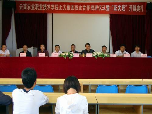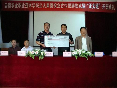 畜牧獸醫(yī)系主任趙躍、副主任法林榮、團(tuán)總支書(shū)記浦仕飛、輔導(dǎo)員張懷輝出席儀式。昆明正大畜禽有限公司副總裁任文輝、人事部經(jīng)理張嘉仁、銷(xiāo)售部經(jīng)理胡禮平等一行6人到場(chǎng)。儀式由