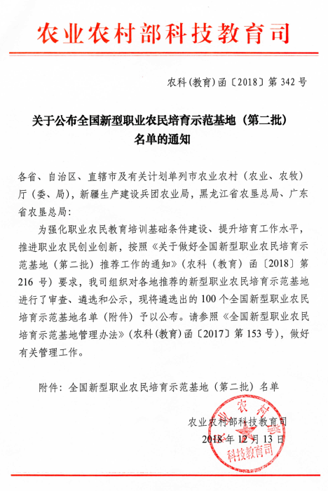為強化職業農民教育培訓基礎條件建設、提升培育工作水平,推進職業農民創業創新,2018年12月13日,我院被農業農村部科技教育司遴選為全國新型職業農民培育示范基地。希望全院教職工以此為契機,努力工作,不斷推動學院社會服務工作再上新臺階,為學院全面發展做出積極貢獻。(黨委宣傳部)