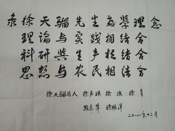 對學院開展這次紀念徐天騮先生的活動,徐聲瑛先生一行深表感動和感慨,非常欣慰學院還有這么多人記住了徐天騮先生以及他為云南做出的貢獻,特別是還以徐天騮先生的名字命名教學樓也讓他們十分意外和高興。為了表達對學院的感激之情,徐聲瑛先生向學院贈送了《徐嘉瑞全集》(全四卷)《徐嘉瑞略傳》《云煙奠基人——徐天騮文選》《云南奠基人——徐天騮》等書籍。同時,還手書徐天騮先生的教學理念一副贈送學院:理論與實踐相結合,科研與生產相結合,思想與農民相結合。