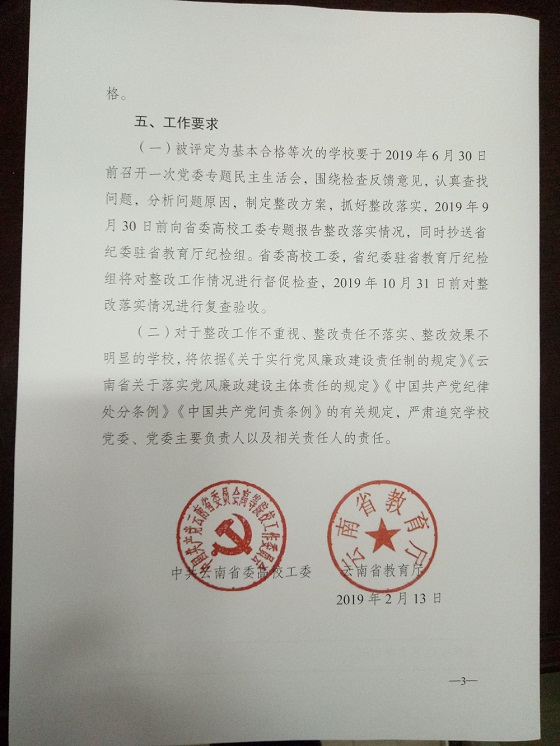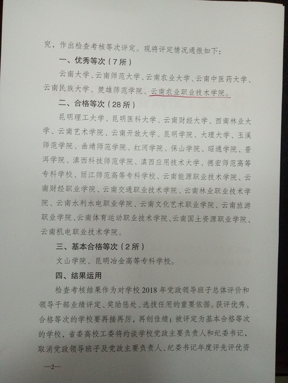 2019年2月13日,中共云南省委高校工委 云南省教育廳通報2018年度省屬高校黨風廉政建設責任制檢查考核等次評定情況,我校被評為優秀等次,也是7所高校中唯一的一家高職院校。
