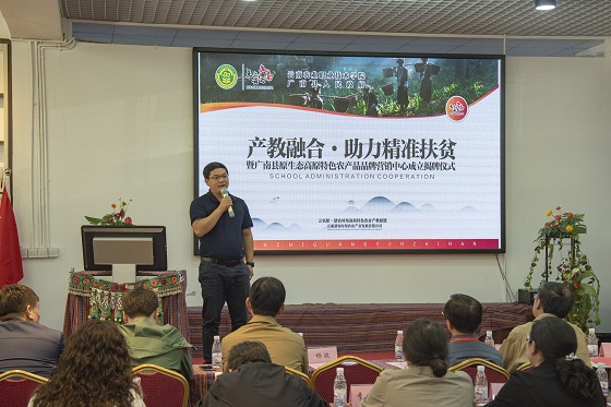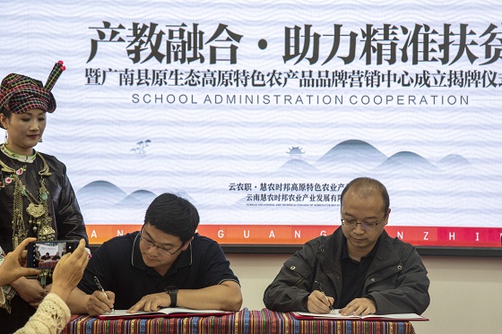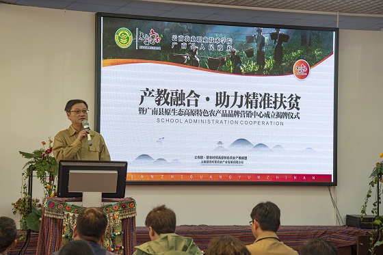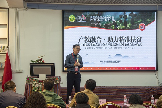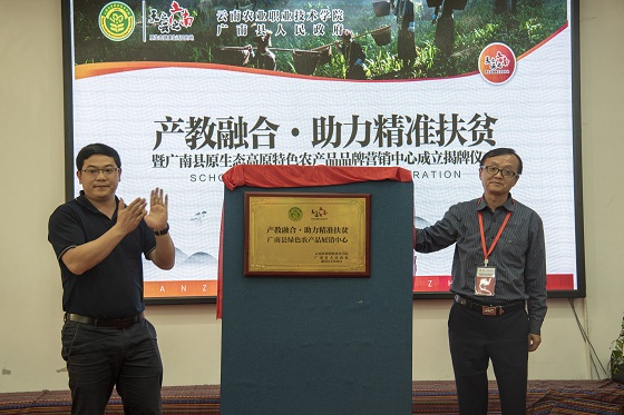 3月29日下午,我院在“云農職·慧農時邦眾創空間”與廣南縣政府簽訂校政戰略合作協議,并成立了廣南縣農產品品牌營銷中心。我院副院長楊波、紀委書記馮志宏、云南中華職教社專職副主任潘慶明、廣南縣副縣長梁忠出席會議并發言。廣南縣農業農村局、工信商務局以及者兔鄉相關部門及單位黨政領導參加會議。我院楊波副院長與廣南縣梁忠副縣長分別代表學院與廣南縣簽署了《校政合作戰略框架協議》;我院紀委馮志宏書記與廣南縣梁忠副縣長分別代表學院與廣南縣為“產教融合·助力精準扶貧廣南縣綠色農產品展銷中心”揭牌。通過此次活動,雙方圍繞國家鄉村振興、助力精準扶貧的政策要求,結合雙方優勢資源共同探索校政合作、產教融合,實現資源整合,優勢互補,積極圍繞農業產業扶貧、技術扶貧、消費扶貧,教育扶貧的方向開展合作。通過云南農業技術學院的專業農業技術解決廣南縣的農業產業生產端問題;通過產教聯盟優化農產品銷售結構,成立廣南縣農產品品牌營銷中心;通過產品品質提升、品牌宣傳、擴展銷售渠道等方式,深化落實精準扶貧、消費扶貧,促進廣南農業產業推動和發展。