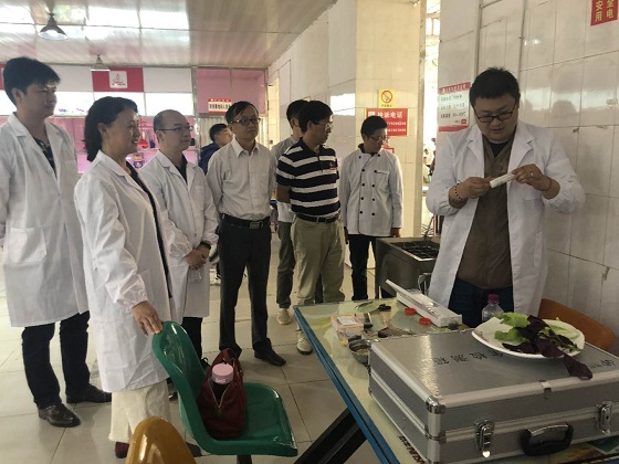 隨后,檢查組分別走訪了田之苑學生食堂、食味坊學生食堂和知味堂食學生食堂。檢查組通過聽取介紹、現場檢查、查看臺帳資料的方式進行實地檢查,就個人衛生、食堂員工對“六T”知識的掌握、標示圖標、視覺管理、地面干燥情況、庫房管理規范存放、清潔衛生、餐具容具消毒、食品質量和加工等多個方面對食堂進行了驗收,同時使用農殘快速檢測的儀器對食堂原材料進行了抽樣檢查。
