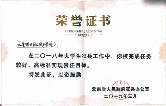 2019年3月28日,云南省人民政府征兵辦公室召開省大學生征兵工作業務培訓會。我院因2018年征兵工作成績突出,喜獲云南省人民政府征兵辦公室表彰,被授予“高標準完成責任目標獎”。現對2018年征兵工作作如下回顧: