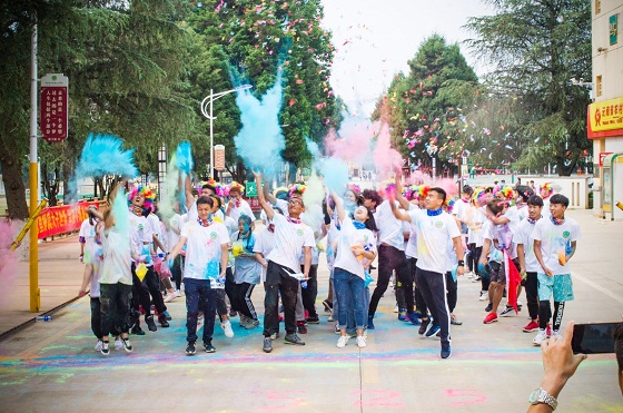 本次彩虹跑的起點設置在學生服務中心門前,沿途經過1號點綜合樓門口,2號點耕道院五棟,3號點農職商業街正大門,4號點菜鳥驛站,5號點維新苑門口廣場,再到6號點鏡臺,最后到達終點鴻翼樓,全程距離三千米。五彩粉末飛揚,隊伍熱情高漲,嚴格按照規定路線進行。大家時而狂奔,時而嬉鬧,時而停下腳步拍照留念,盡管沿途很累很辛苦,但每一個人臉上都洋溢著燦爛的笑容,共同體驗了最開心、最多彩、最縱情的狂歡,并在張揚的色彩里分享幸福和喜悅。