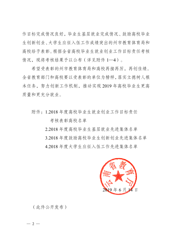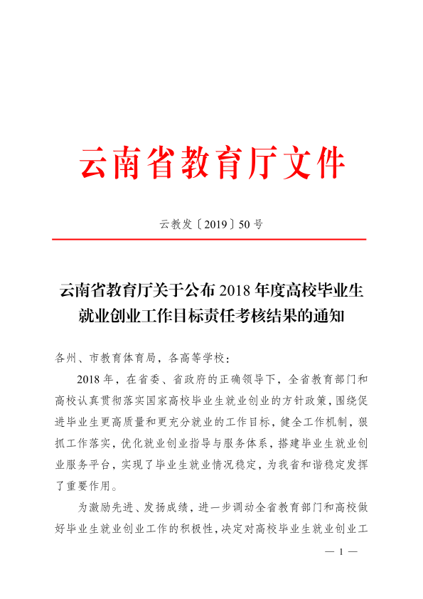 6月14日,云南省教育廳公布了2018年度高校畢業生就業創業工作目標責任考核結果,我院在2018年度高校畢業生就業創業工作目標責任考核中再次被表彰為優秀高校,同時,我院還被表彰為2018年度鼓勵高校畢業生創新創業先進集體。據了解,這次表彰是我院在高校畢業生就業創業工作目標責任考核中連續8年、在鼓勵高校畢業生創新創業工作中連續3年獲此殊榮。希望全院各部門珍惜榮譽,落實立德樹人根本任務,不斷創新工作機制,推動實現2019年我院畢業生更高質量和更充分就業(黨委宣傳部)