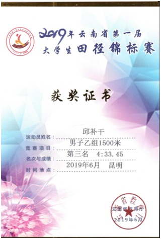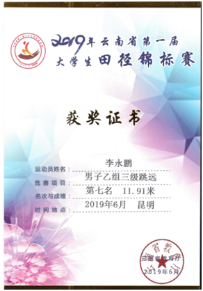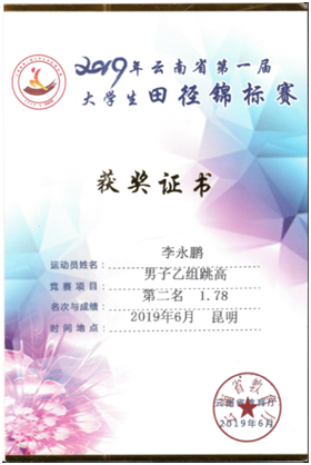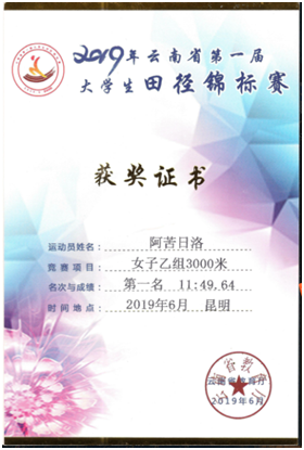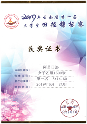 通知中心2019年云南省第一屆大學生田徑錦標賽于6月21日至23日在昆明學院舉行。由田應華副院長為領隊的學院田徑隊,在教練于武文指導下,全隊4名隊員在兩天半時間內通過頑強拼博,展現了學院的良好形象,在非體育專業組比賽中一共獲得2金2銀1銅,1個第四名和2個第七名的好成績。獲獎如下:阿苦日洛獲女子3000米第一名和女子1500米第一名;李永鵬獲男子跳高第二名和男子三級跳遠第七名;袁若曦獲女子跳高第四名和女子三級跳遠第七名;邱補干獲男子5000米第二名和男子1500米第三名。