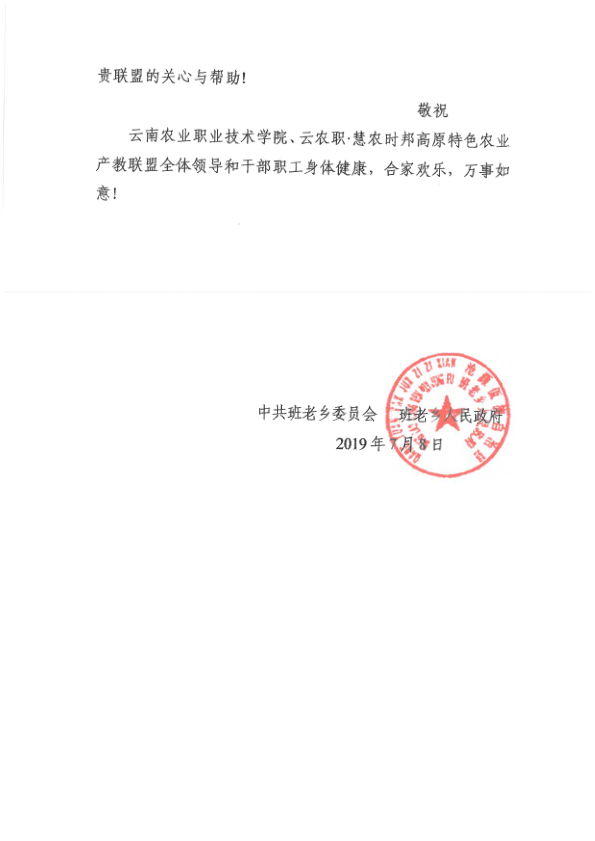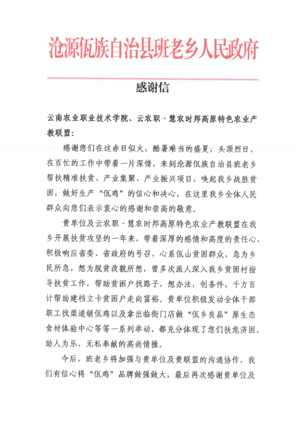 7月8日,滄源縣班老鄉黨委和人民政府寫信感謝學院對其進行支持幫扶。感謝學院及產教聯盟平臺積極響應省委、省政府的號召,心系佤山貧困群眾,帶著深厚的感情和高度的責任心,在班老鄉開展脫貧攻堅,深入貧困村指導扶貧工作,幫助貧困戶找路子,想辦法,創條件,千方百計幫助建檔立卡貧困走向富裕,特別是找渠道銷售佤雞及拿出臨街門店做“佤鄉良品”原生態食材體驗中心等等一系列舉動,極大地提升了佤鄉人民將“佤雞”品牌做強做大的信心。(黨委宣傳部)