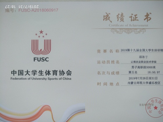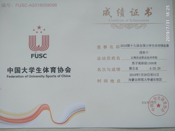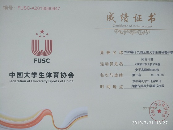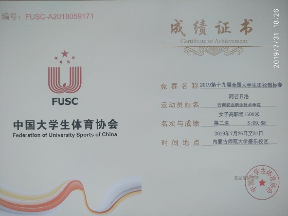 通知中心7月26日—31日,由中國大學生體育協會、中國田徑協會共同主辦,呼和浩特市人民政府、內蒙古師范大學共同承辦的2019第十九屆全國大學生田徑錦標賽在內蒙古師范大學盛樂校區拉開帷幕。我院田徑隊經過奮勇拼搏,在髙職髙專組比賽中取得一金一銀和兩個第五名的好成績。其中:阿苦日洛同學榮獲女子5000金牌和1500米銀牌,邱補干同學榮獲男子1500米第五名和5000米第五名。