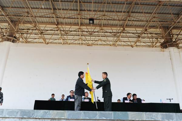 黨委書記崔金賦為軍訓團授旗,把學院校旗授予昆明民族干部學院一大隊政治委員司馬迅靈。