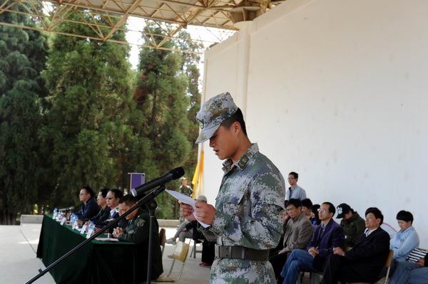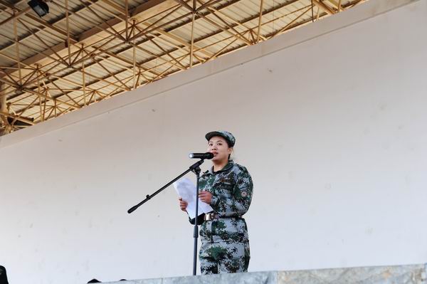畜牧獸醫學院14級畜牧獸醫(3+2)2班的張耀丹作為學生代表發言。張耀丹同學代表全體參加軍訓的學員承諾,一定秉承精誠團結,學用結合,善謀實干,知難而進創新發展的精神,在軍訓中堅決服從教官的指揮,以現代人的品質、現代人的氣魄,嚴肅認真,高標準、高質量地完成好本次軍訓!并以此為動力,用自信、勤奮、意志來武裝自己,努力學習,踏實工作,用智慧、勇氣和永不服輸的年輕心,向著生命中每一座山峰,勇敢攀登,從稚嫩走向成熟,從現在走向成功,為學校增光添彩!