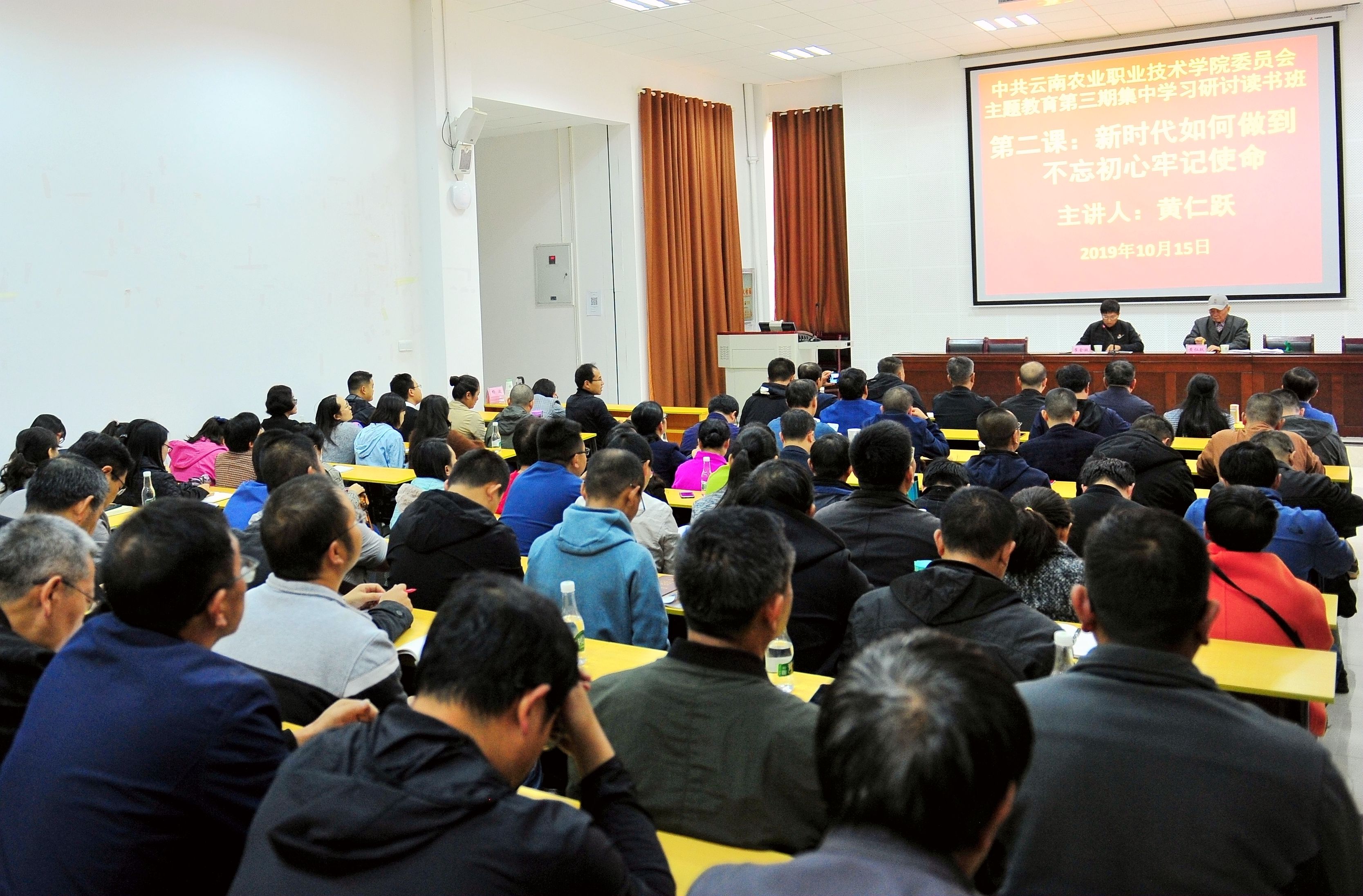 通知中心10月15日下午,學院舉辦第三期集中學習研討讀書班,邀請云南農業大學原黨委書記、校長黃仁躍老教授到校,作“新時代,如何做到“不忘初心、牢記使命”專題講座。全體在職黨員及副處以上非黨干部200余人參加,講座由黨委書記崔金賦同志主持。