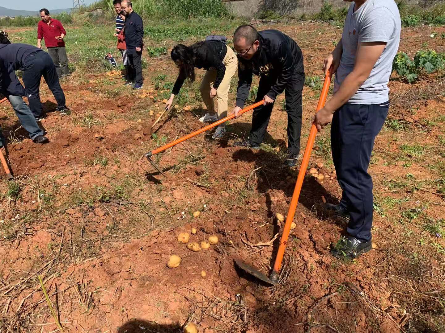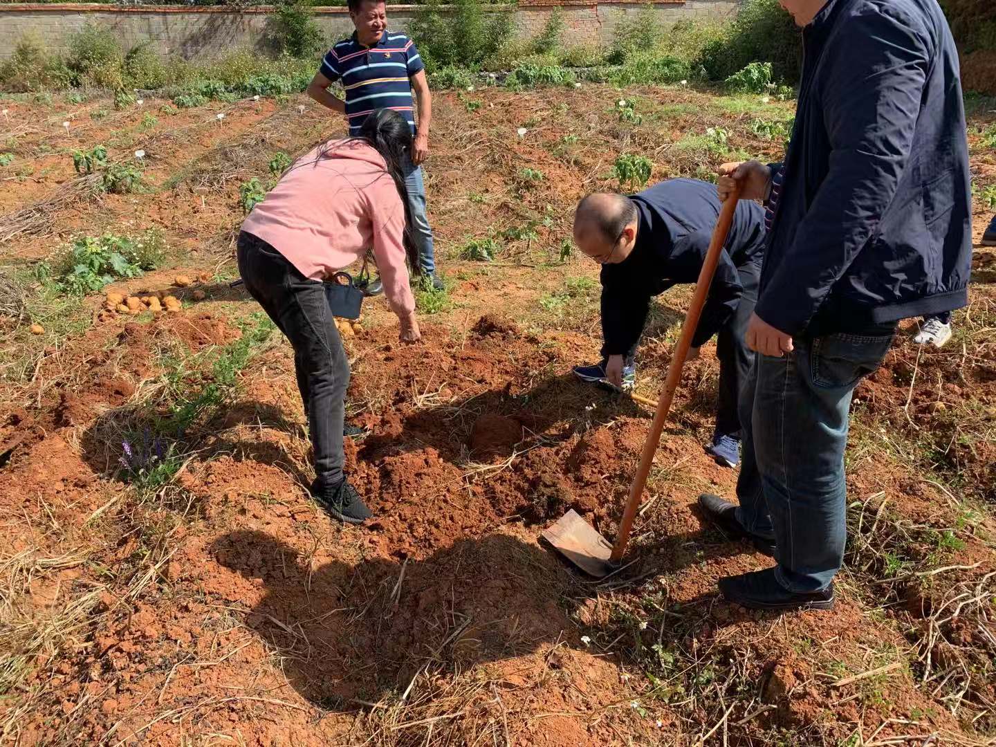 在油菜田邊,對外合作交流處處長張國建同志向黨員同志們介紹了油菜種植需要注意的問題和學生在田間實操情況及取得的成效。來到蘿卜和土豆的種植地,黨員同志們在黨委委員、副院長趙鴻陽、楊波同志帶領下,頂著烈日,開始挖蘿卜、刨土豆、割除雜草的分工勞動。隨著鋤頭的舞動,汗水不斷滴下,一個個蘿卜、土豆被翻挖出來,偶有個頭較大的蘿卜和土豆出現,都會引起大家的驚呼、贊嘆,同時一堆堆被割除的雜草也讓大家充滿了成就感。