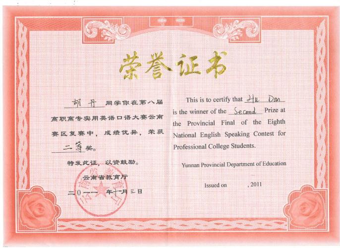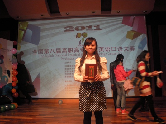 2011年11月3日上午,第八屆全國高職高專實用英語口語大賽云南賽區復賽在云南文化藝術職業學院舉行。我院第二屆“英語之星”——2010級農產品檢測專業胡丹同學代表學院參加了該項比賽,并榮獲大賽非專業組二等獎。