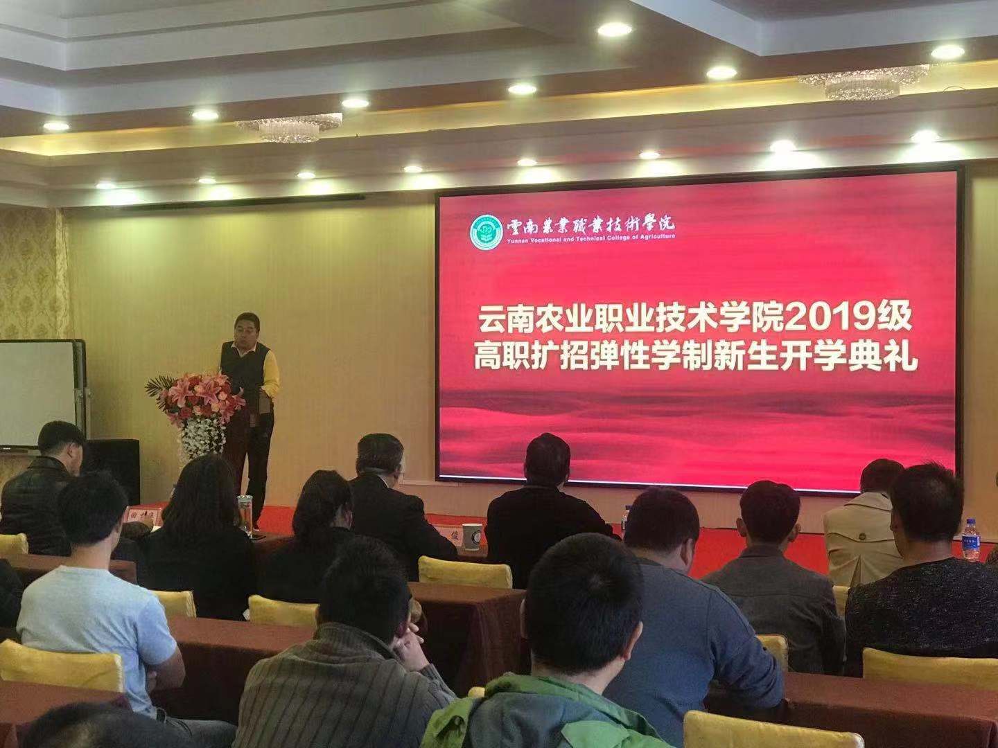 通知中心11月15日下午,學院在農職培訓中心三樓報告廳舉行2019級高職擴招彈性學制新生開學典禮。院長文俊、副院長田應華以及昆明華曦牧業集團董事長馬迅出席,學院黨委宣傳部、教務處、招生就業處、食品藥品與大健康學院、經濟管理學院、農學與園藝技術學院等部門負責人和2019級高職擴招彈性學制新生共100余人參加了開學典禮。開學典禮由副院長田應華主持。