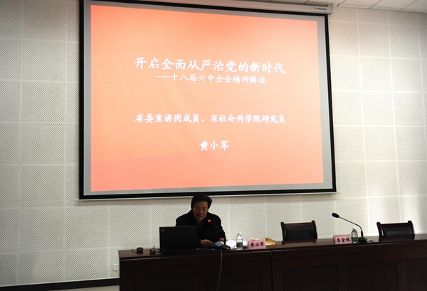 會上,黃小軍教授的報告題為《開啟全面從嚴治黨的新時代---十八屆六中全會精神解讀》專題報告。報告會上,黃小軍教授圍繞十八屆六中全會的主題與現實考量、十八屆六中全會的重大意義、堅定不移推進全面從嚴治黨、全面加強和規范黨內政治生活、全面落實黨內監督責任、突出抓好領導干部特別是高級干部和不斷把黨的建設新的偉大工程推向前進等七個方面全面深入的宣講了黨的十八屆六中全會精神。