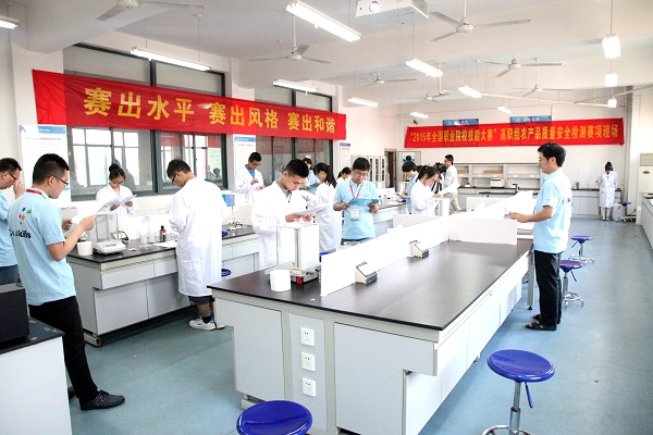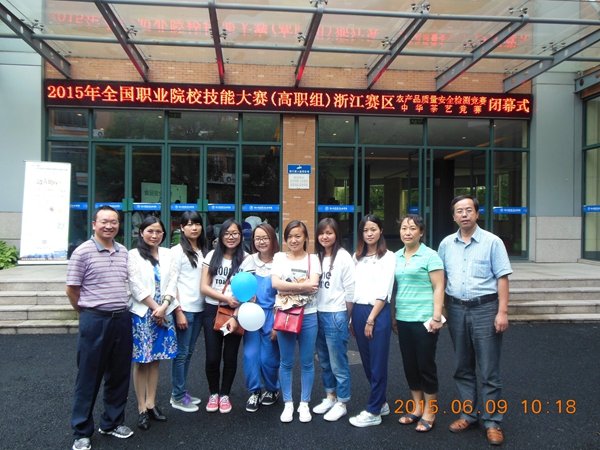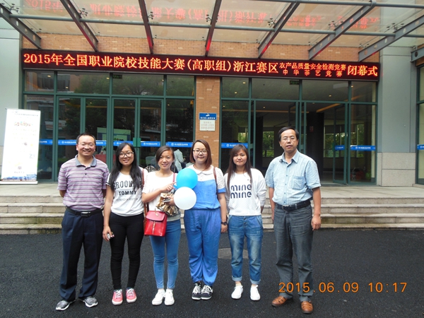6月5日-9日,2015年全國職業院校技能大賽“農產品質量安全檢測”賽項在浙江經貿職業技術學院生物與食品技術綜合實訓基地開賽。該賽項包括“茶葉中重金屬含量的檢測”、“畜禽肉中氟喹諾酮類獸藥殘留的檢測”和“蔬菜中有機磷類農藥殘留的檢測”等三個項目。145名參賽選手來自全國27個省市70多所高等職業院校。云南省代表隊由我校教務處張江榮處長任領隊,帶隊兼指導老師張懷輝,我校參賽選手包括金小婷、李嫦蕊、羅丹、劉薇;玉溪農業職業技術學院派出選手秦雪丹(帶隊兼指導老師李玉萍);大理農林職業技術學院選手李璐伊(帶隊兼指導老師嚴文芳)。