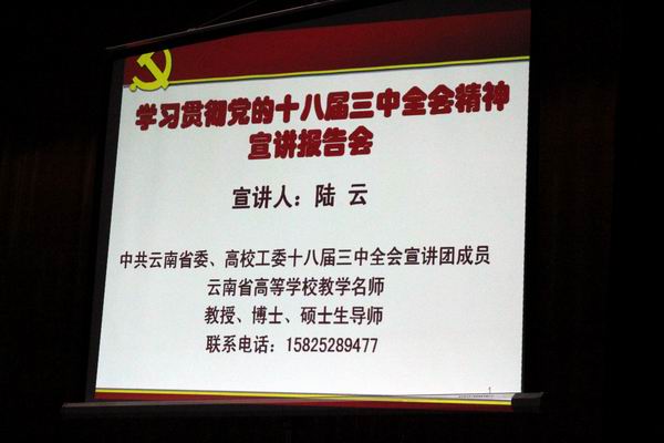 為深入學習貫徹黨的十八屆三中全會精神,引導全院廣大干部師生把思想統一到全會精神上來,推動興起學習宣傳貫徹全會精神的熱潮,根據省委高校工委的統一安排部署,我院于12月11日邀請到云南省高校學習貫徹黨的十八屆三中全會精神宣講團成員、大理學院馬列部教授陸云到小哨校區舉辦宣講報告會。