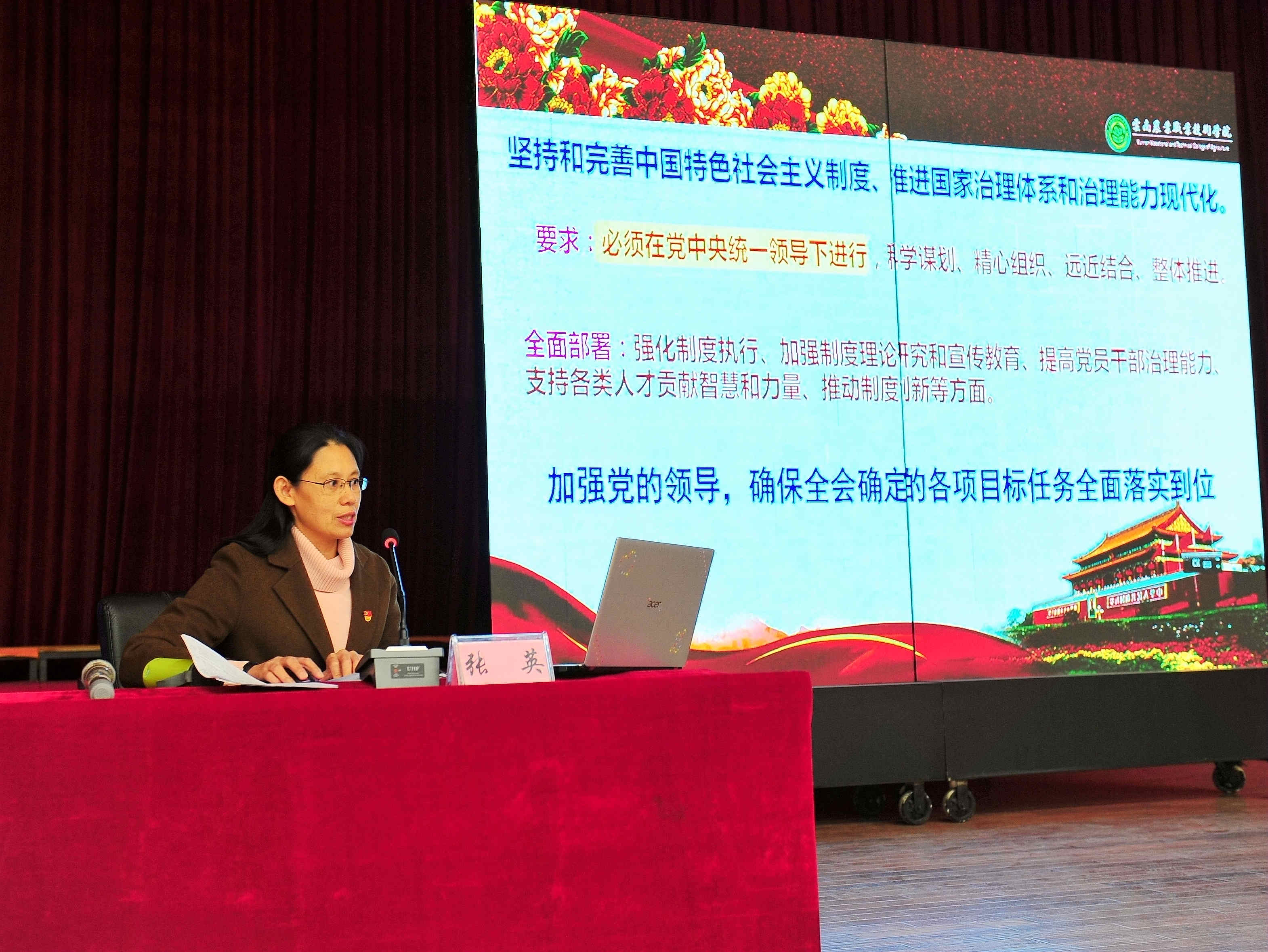 思想政治理論課教學科研部主任張英從加強黨的領導,確保全會確定的各項目標任務全面落實到位方面進行了重點強調。她指出,一是要毫不動搖的堅持和鞏固中國特色社會主義制度,二是要與時俱進完善發展中國特色社會主義制度和國家治理體系,三是要嚴格遵守和執行中國特色社會主義制度。