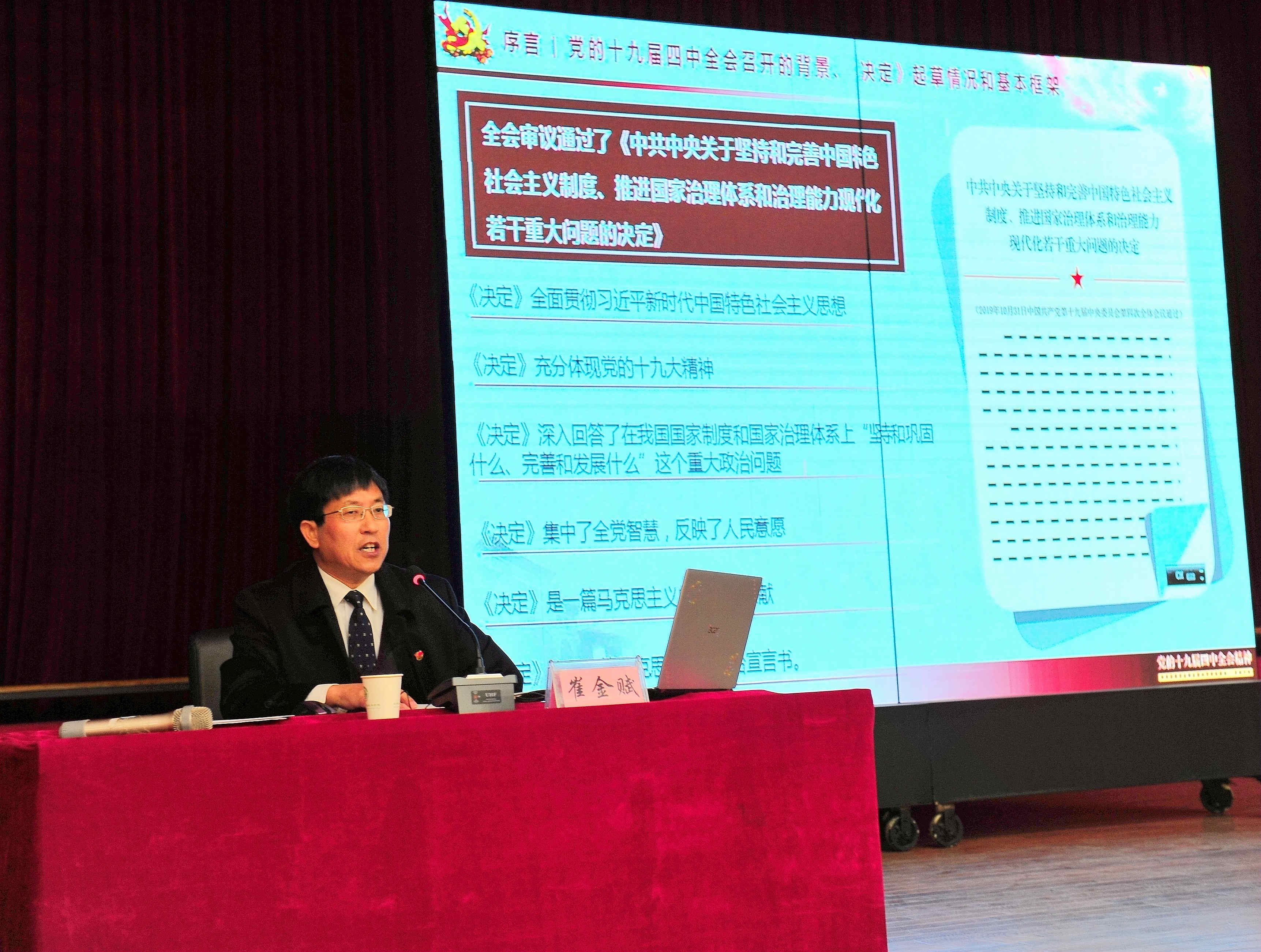 在宣講中,黨委書記崔金賦從黨的十九屆四中全會召開的背景、《決定》起草情況和基本框架、充分認識堅持和完善中國特色社會主義制度、推進國家治理體系和治理能力現代化的重大意義;深刻領會中國特色社會主義制度和國家治理體系的顯著優勢,堅定中國特色社會主義制度自信等方面對黨的十九屆四中全會精神作了詳細解讀。他要求全校教職工要全面深入學習,充分認識和準確把握黨的十九屆四中全會的重大意義和主要精神。黨員領導干部帶頭學、基層黨組織跟進學、專題培訓系統學、聯系實際深入學,實現全校干部師生的全覆蓋,把握全會精神的核心要義,把思想和行動統一到全會精神上來。