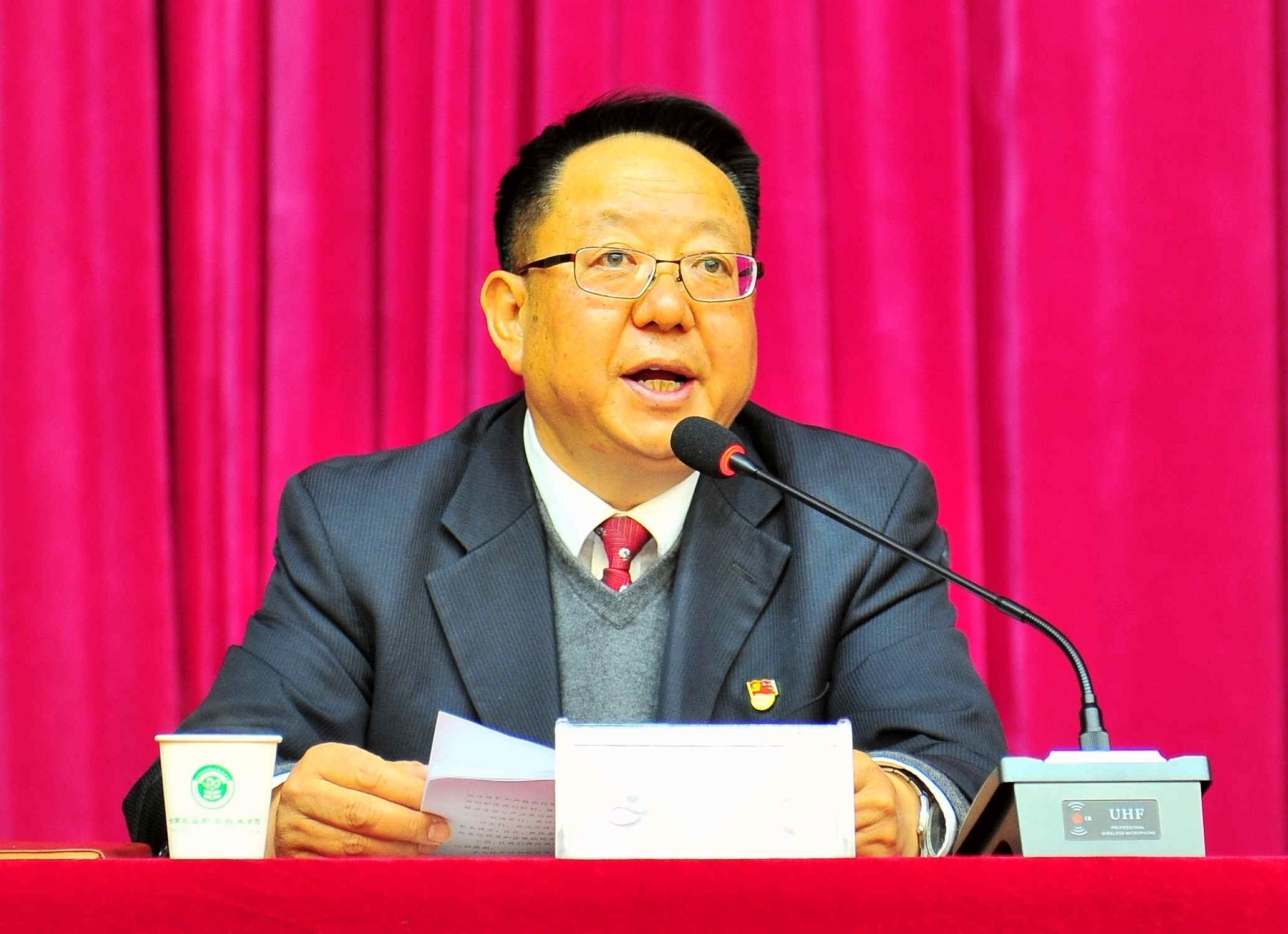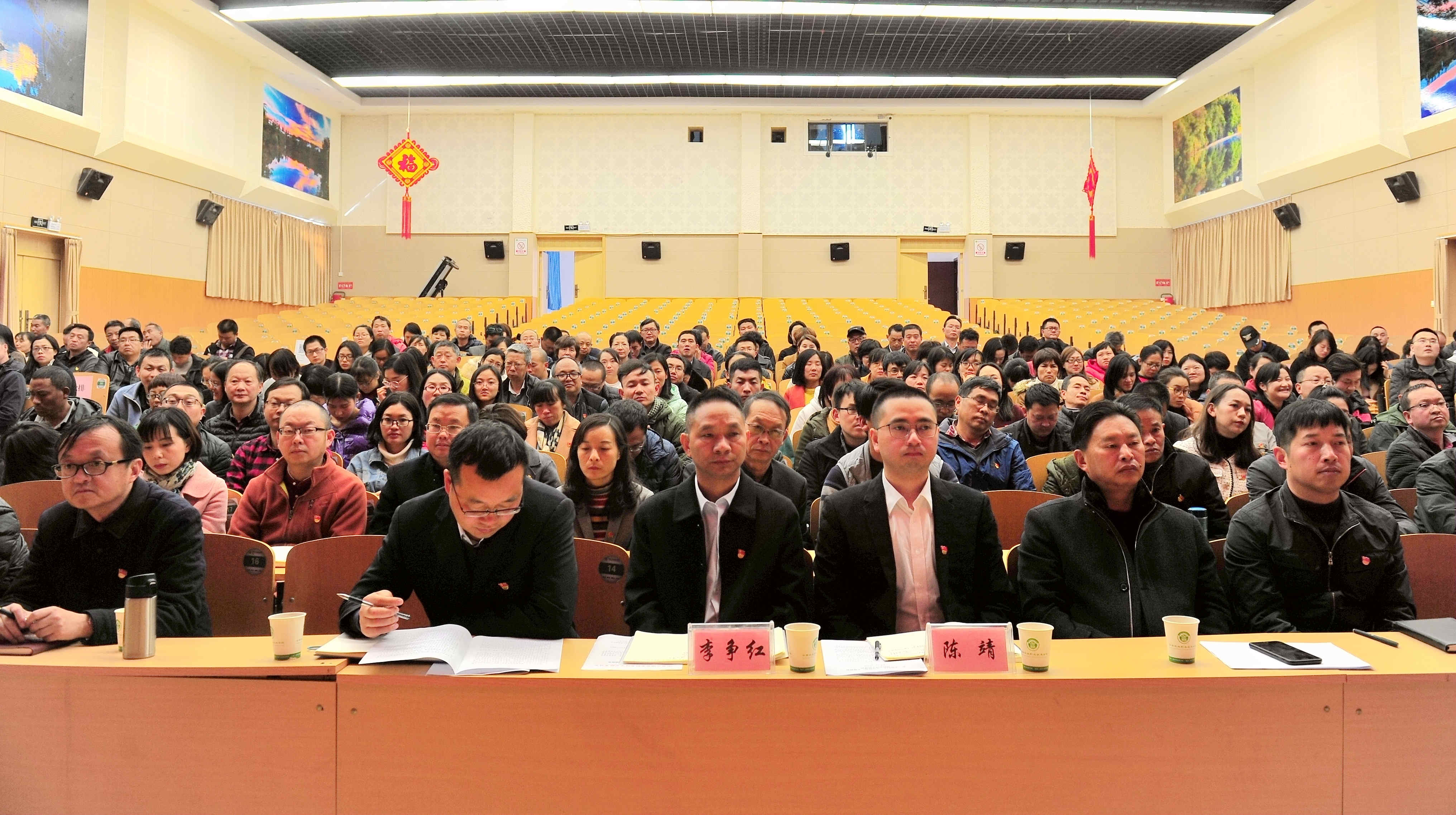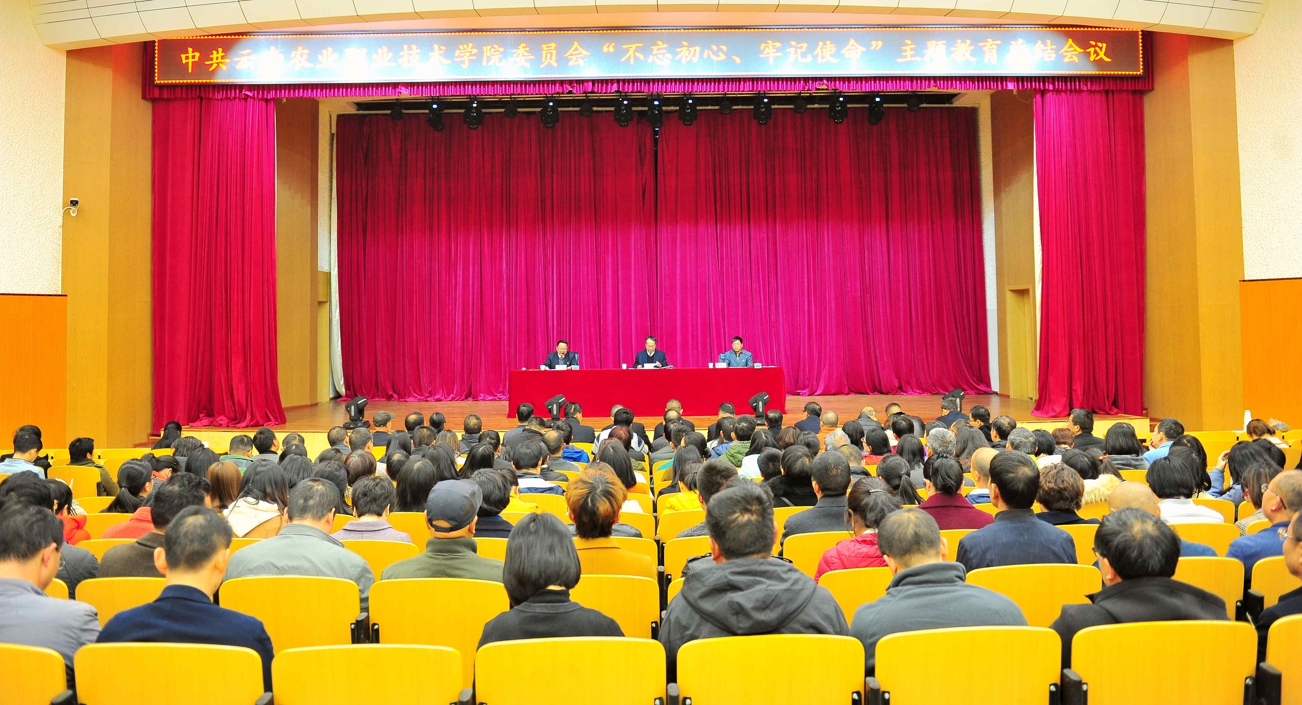 1月13日下午,學院在小哨校區蠶桑禮堂召開“不忘初心、牢記使命”主題教育總結會議。會議的主要任務是:學習中央、省委主題教育總結會議精神,對學院主題教育進行全面總結,并對下一步工作進行安排部署。省委第二十指導組副組長、省財貿工會主席張松同志,指導組成員李爭紅、陳靖同志蒞臨會場指導。學院黨委班子成員、非中共黨員院領導,省種畜繁育推廣中心、省種禽繁育推廣中心和省原種豬繁育推廣中心領導班子成員,學院全體在職黨員,離退休黨支部書記,學院副處級及以上非中共黨員領導干部300多人參加了會議。會議由黨委副書記、院長文俊主持。