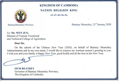1月23日下午,柬埔寨班迭棉吉省副省長代表省長在省政府副秘書長、波貝市長、農業廳長、財經廳長、瑪萊縣長、棉吉大學副校長等部門領導的陪同下,到云南農業職業技術學院柬埔寨班迭棉吉農業科技示范培訓教學實習實訓基地進行視察及中國春節慰問。副省長一行仔細查看了基地開展的工作,對工作組所付出的努力和所取得的成績表示充分肯定,并向在春節期間仍在柬堅持工作的全體工作組成員表示慰問。與此同時,還收到了班迭棉吉省翁德利省長閣下致學院文院長和工作組的春節慰問信;工作組也向省長閣下轉達了文院長的祝福:祝省長閣下,身體健康、工作順利、萬事如意。