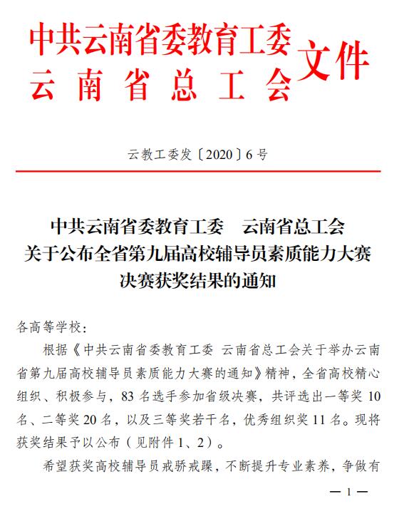 通知中心2月18日,省委教育工委和省總工會聯合發(fā)文公布全省第九屆高校輔導員素質能力大賽決賽獲獎結果,我院徐率老師從83名競爭對手中脫穎而出,榮獲本次大賽三等獎。