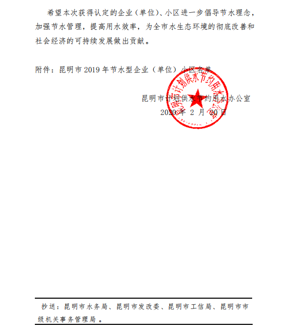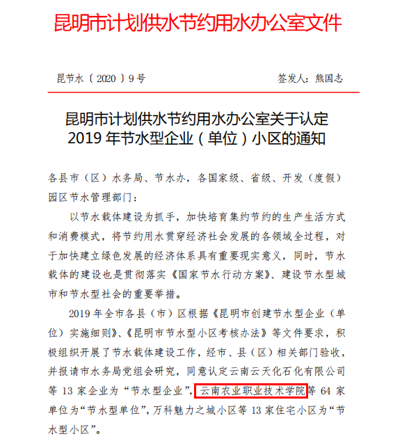 我院被昆明市計劃供水節約用水辦公室認定為2019年“節水型單位”,希望全院師生以此為契機,積極倡導校園節水理念,加強節水管理,提高用水效率,改善水生態環境;培育廣大師生集約節約的生產生活方式和消費模式,將節約用水貫穿到當今經濟社會發展的各領域全過程,同時以綠色發展為理念,為我院下一步申報綠色大學奠定堅實的基礎。(黨委宣傳部)