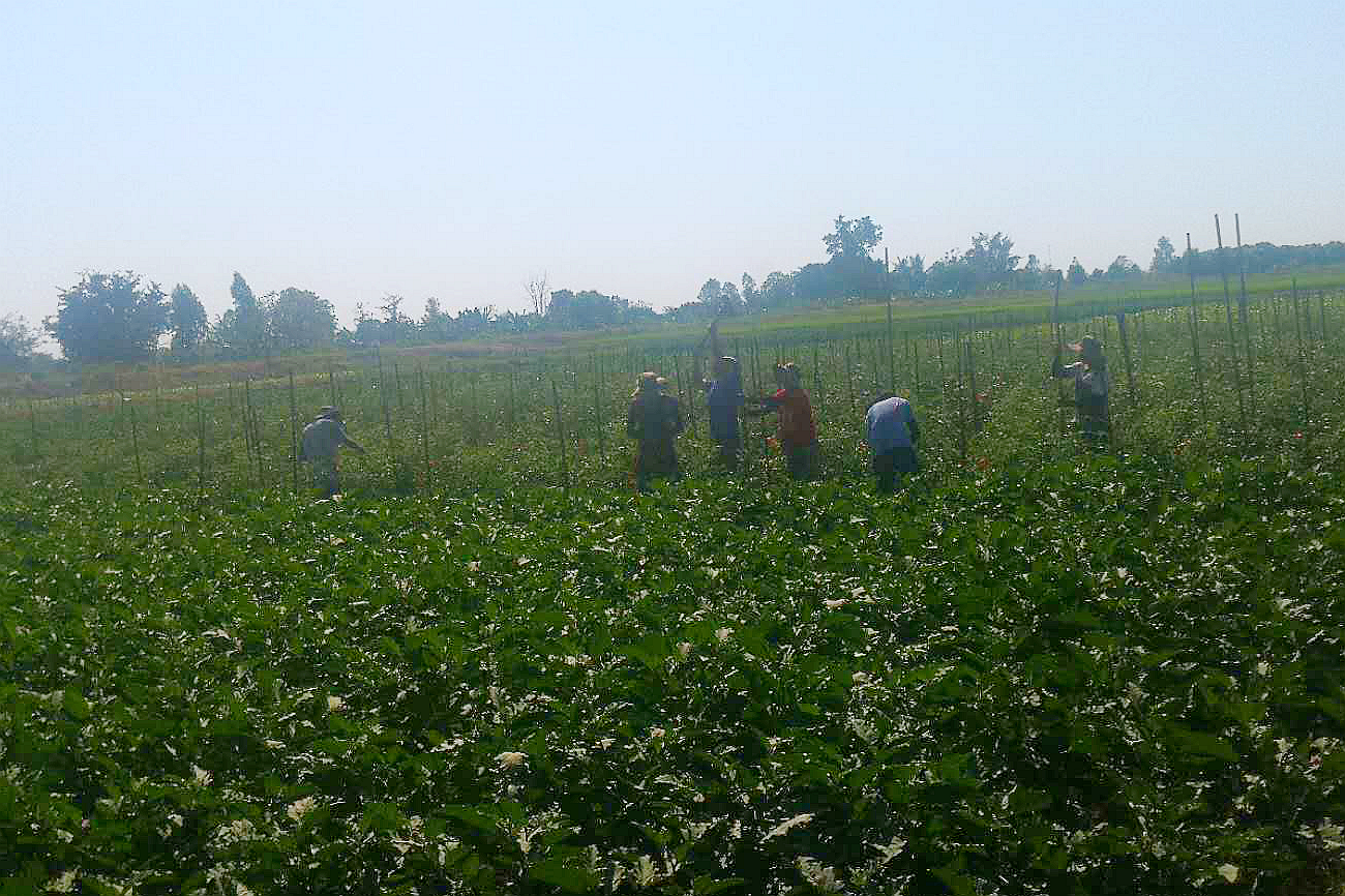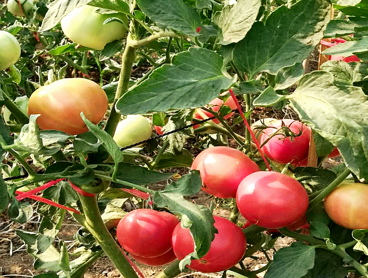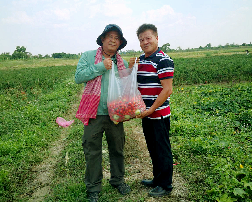 3、蔬菜示范展示的亮點是:當地番茄品種特點是耐高溫、抗病性好,但是果型小,產量低;而中國的番茄品種是果型大、產量高,但是在柬埔寨熱帶氣候條件,不耐高溫、抗病性差(枯萎病嚴重)??上驳氖鞘痉秷@(基地)通過多年的多品種引種到基地種植篩選,把較耐高溫、抗病單株種子帶回到國內學院基地大棚內在高溫、高濕條件下雜交轉育,現已獲得3個類型(普通生長型、無限生長型、有限生長型)的株系和1個水果型小果類番茄株系在基地種植獲得成功。已把今年示范種植的4份株系種子送班迭棉省政府交由農業廳和部隊蔬菜種植基地試驗種植。