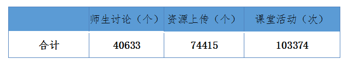 在3月份的線上教學期間,共發起師生討論40633個,上傳資源74415個,開展教學活動103374個。豐富新穎的線上資源,極大的保障了在線教學的有效實施,點燃了學生線上學習熱情。