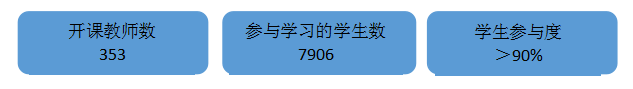 學院本學期共開設網絡在線課程365門,在線開設課程教師353位,參與學生人數7906人,參與度達到了90%以上。