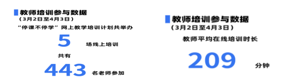 為滿足教師網絡教學需求,教務處整合網絡資源,制定了教師線上自主提升實施方案。同時,針對教師開展線上教學普遍面臨的平臺使用和技術問題,在開學前后組織全體教師開展了5場線上專題培訓,共有443名教師參加培訓,教師平均在線培訓時長達209分鐘,進一步提升教師信息化水平。同時,通過建立線上交流群與教師即時互動,輔以直播、推文、工作手冊等方式及時為教師答疑解惑。
