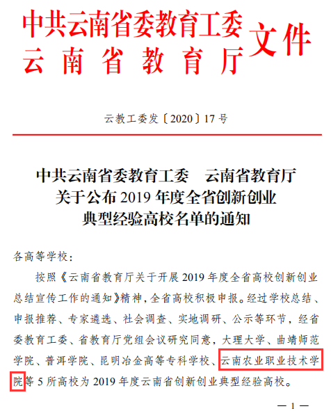 近日,省委教育工委和省教育廳聯合發文公布全省2019年度全省創新創業典型經驗高校,我院獲評2019年度云南省創新創業典型經驗高校。