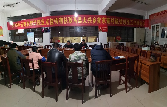2月14日晚21:00,在大興鄉龔家寨村委會與學院駐村工作隊及龔家寨村委會干部召開脫貧攻堅工作推進會議。在會上,文俊院長結合中央經濟工作會議、中央農村工作會議、全國全省扶貧開發工作會議、省委十屆六次全會、省“兩會”、云南省高校“掛包幫、轉走訪”工作聯席會議第五次會議暨教育扶貧領域腐敗和作風問題專項治理工作推進會議有關精神,傳達中央、省委省政府對脫貧攻堅的部署要求。會上,聽取大興鄉、龔家寨村委會及駐村工作隊有關脫貧攻堅工作情況的匯報,了解耿馬縣、大興鄉和龔家寨村脫貧攻堅工作以及下一步脫貧攻堅工作的打算,充分聽取基層干部對2019年脫貧攻堅工作的意見和建議,分析困難問題,研究提出對策措施。