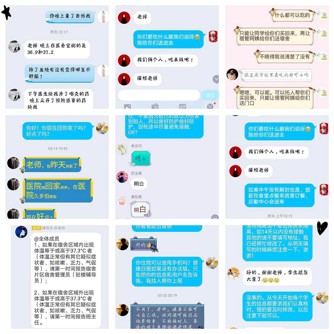 通知中心為確保疫情期間學生學習生活順利開展,按照學院防疫工作部署的要求,學院輔導員堅持24小時在線,始終“電腦不關機、手機不離身”,孜孜不倦地“戰斗”在抗疫戰線,每日關注疫情數據、摸排學生狀況、轉發官方信息等,這群“戰士”用實際行動認真落實各項防控措施,從點點滴滴托起學生的信念和希望,為打贏疫情防控阻擊戰默默地貢獻著自己的力量。