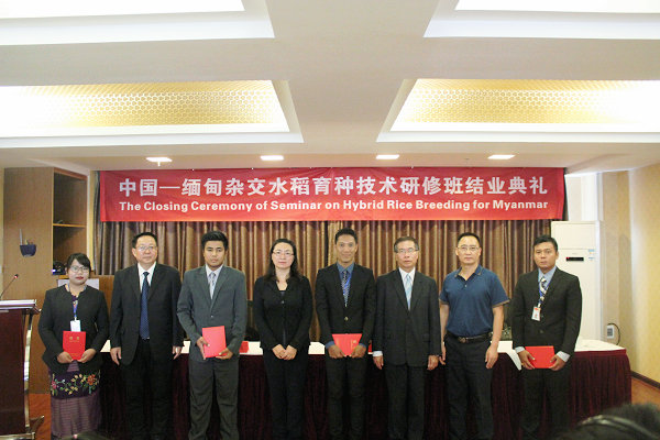 6月29日上午9:30,在昆明市楚雄大廈四號會議室,舉辦緬甸雜交水稻育種技術研修班結業典禮。農業部國際交流服務中心副主任季文遠同志、云南省農業廳廳長助理陳潔同志、廳對外交流合作處副處長胡新梅同志,云南農業職業技術學院院長文俊同志、黨委副書記、副院長、紀委書記季佳元同志、對外合作交流處處長凌軍同志、黨院辦主任金吉斌同志等相關負責同志出席結業儀式。儀式由季佳元副書記主持。