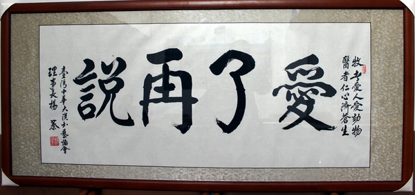 機緣湊巧,此幅書法系今年暑期臺北市中國書畫學會理事長、中華大漢書藝協會理事長楊蓁老先生隨學院何明東副院長游小哨時,為畜牧獸醫系系訓“愛了再說”所作。