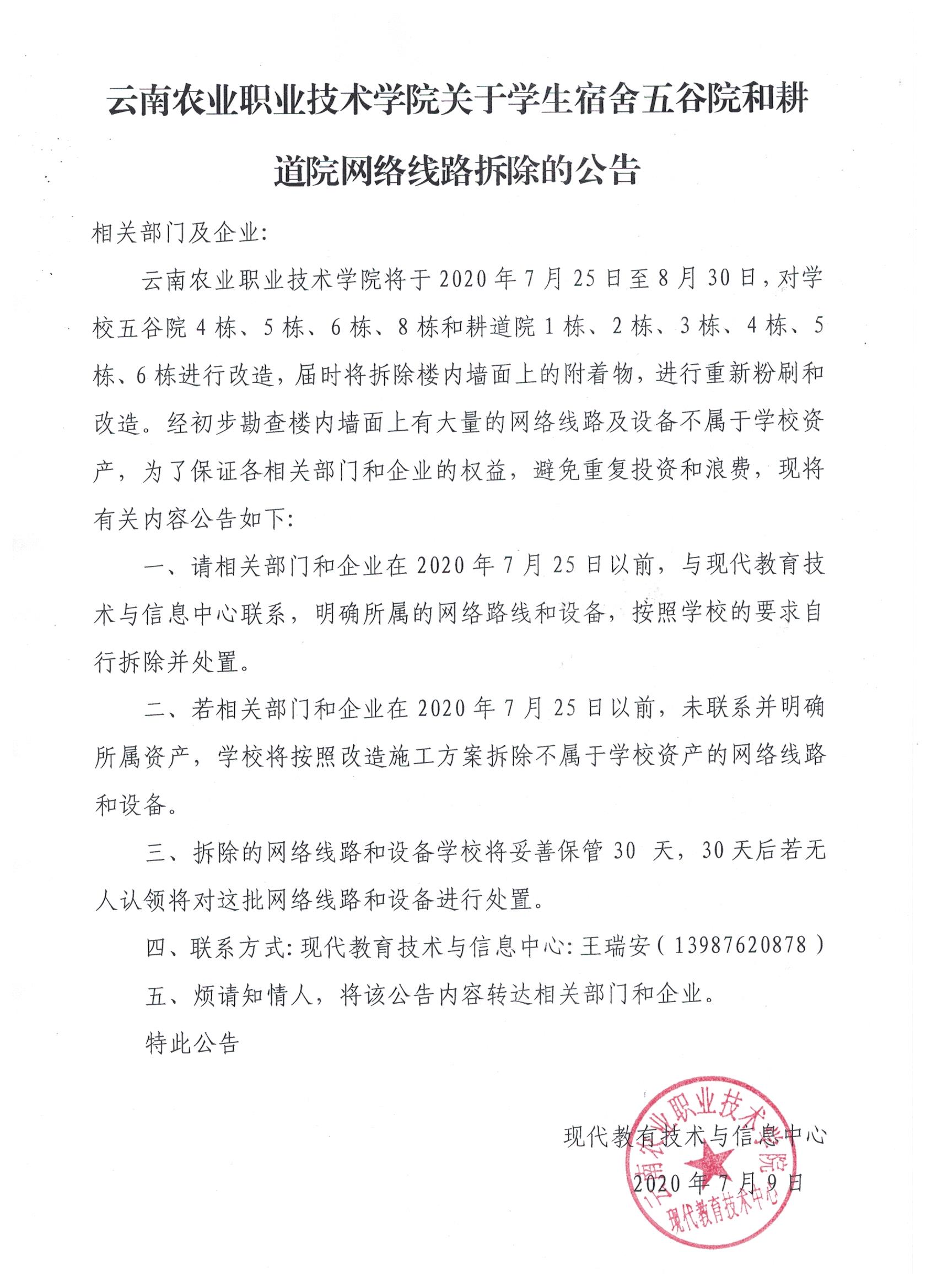 關于學生宿舍五谷院和耕道院網絡線路拆除的公告