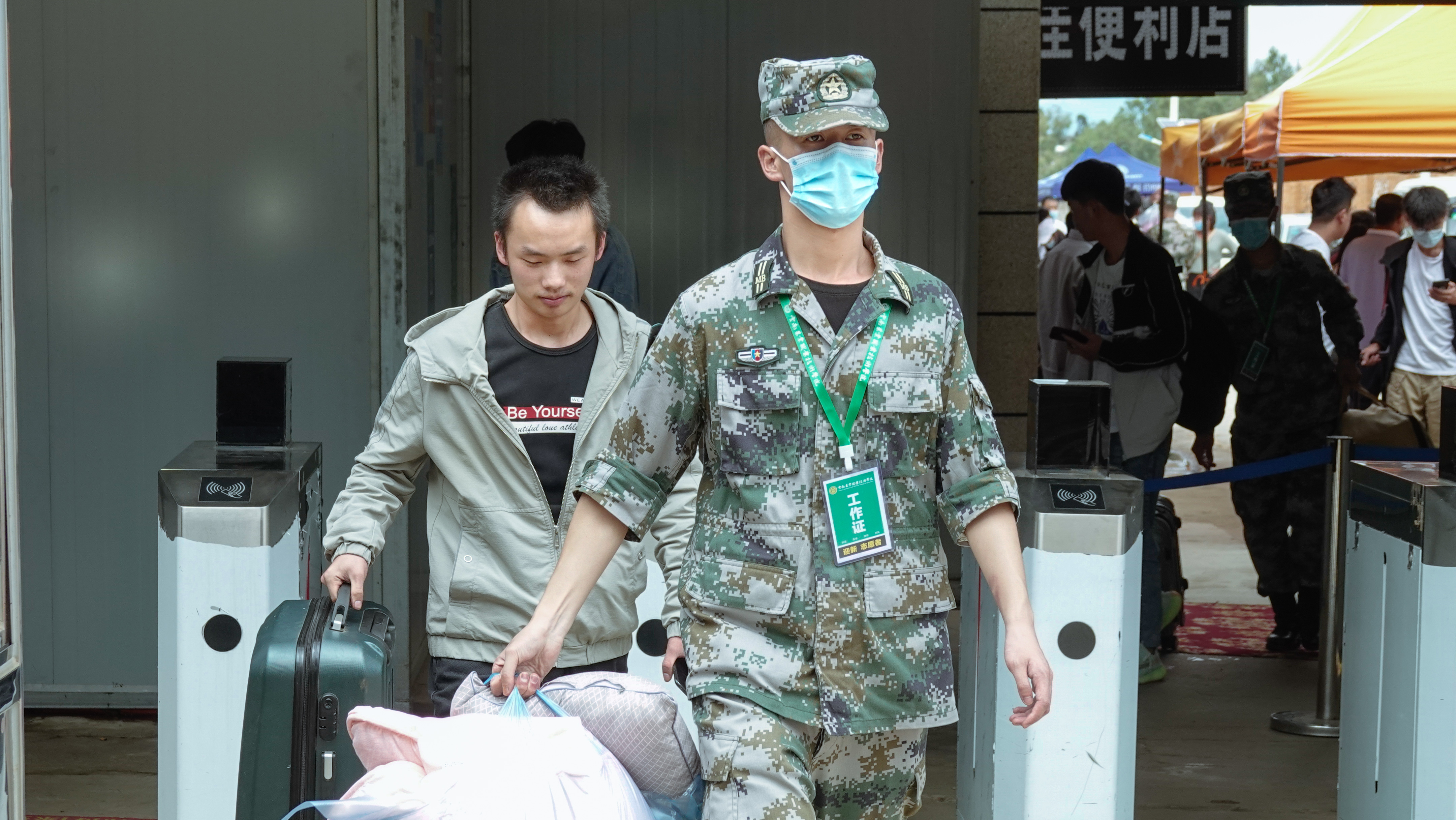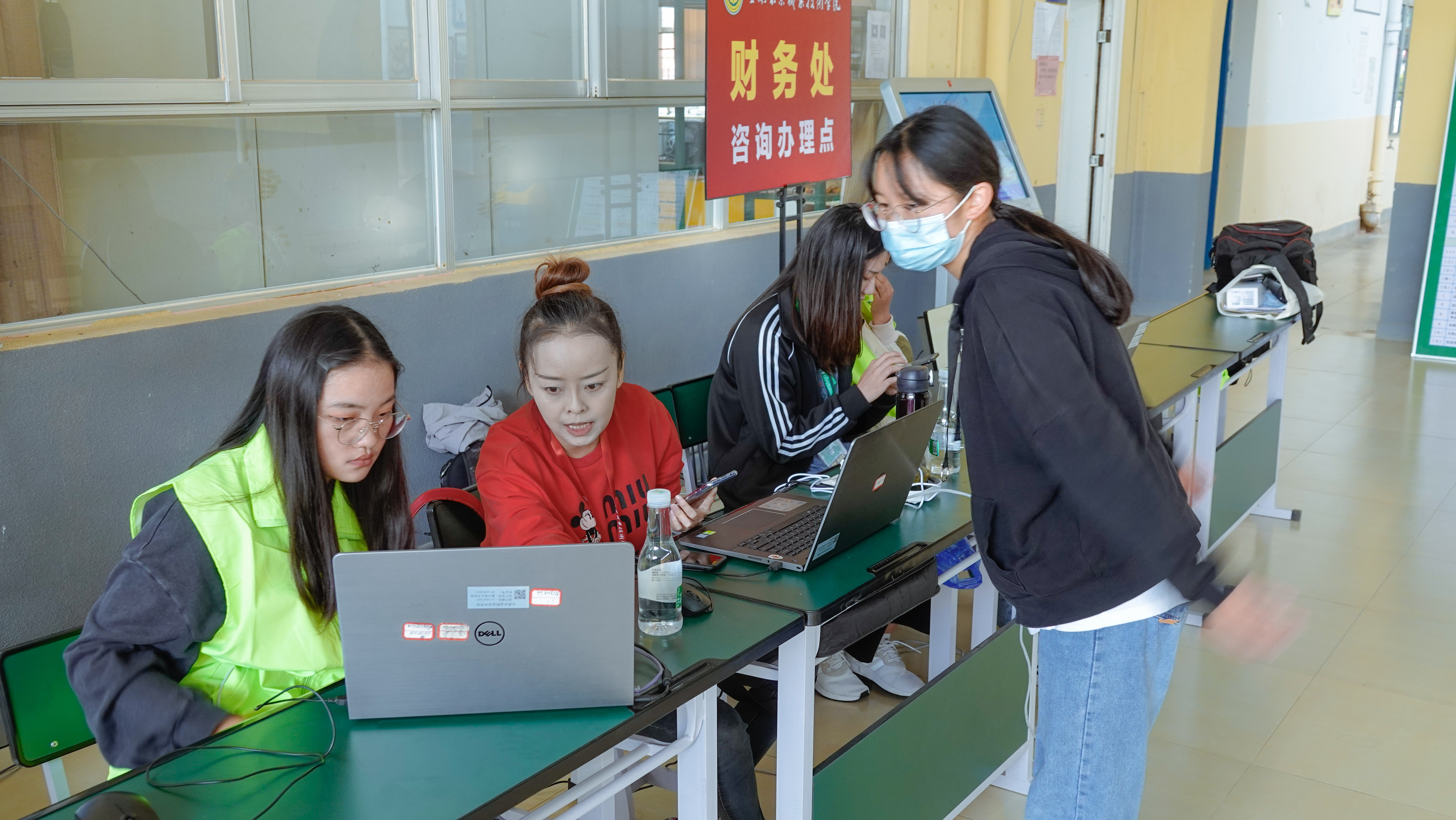 (圖三)二級學院迎新點的志愿者翹首以盼2020級“小萌新”們到來