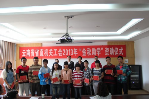 十年寒窗,金榜題名,金秋助學(xué),成就夢想。8月19日上午,省直機關(guān)工會在我院舉行2013年“金秋助學(xué)”活動助學(xué)金發(fā)放儀式,學(xué)院11名品學(xué)兼優(yōu)考上二本以上家境貧困的職工子女每人分別獲得3000元的助學(xué)金。云南省省直機關(guān)工會陸溪部長、云南省農(nóng)業(yè)廳機關(guān)黨委副書記王俊秀、學(xué)院黨委書記崔金賦、黨委副書記趙剛出席會議,會議由黨委副書記趙剛主持。