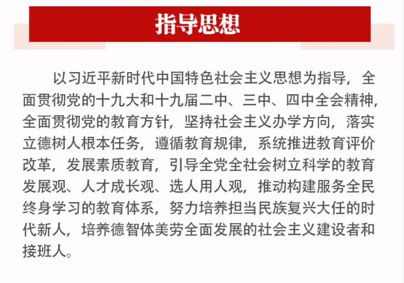(一)指導(dǎo)思想。以習(xí)近平新時代中國特色社會主義思想為指導(dǎo),全面貫徹黨的十九大和十九屆二中、三中、四中全會精神,全面貫徹黨的教育方針,堅持社會主義辦學(xué)方向,落實立德樹人根本任務(wù),遵循教育規(guī)律,系統(tǒng)推進教育評價改革,發(fā)展素質(zhì)教育,引導(dǎo)全黨全社會樹立科學(xué)的教育發(fā)展觀、人才成長觀、選人用人觀,推動構(gòu)建服務(wù)全民終身學(xué)習(xí)的教育體系,努力培養(yǎng)擔(dān)當(dāng)民族復(fù)興大任的時代新人,培養(yǎng)德智體美勞全面發(fā)展的社會主義建設(shè)者和接班人。