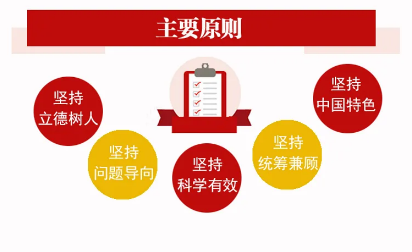 (二)主要原則。堅持立德樹人,牢記為黨育人、為國育才使命,充分發(fā)揮教育評價的指揮棒作用,引導(dǎo)確立科學(xué)的育人目標(biāo),確保教育正確發(fā)展方向。堅持問題導(dǎo)向,從黨中央關(guān)心、群眾關(guān)切、社會關(guān)注的問題入手,破立并舉,推進教育評價關(guān)鍵領(lǐng)域改革取得實質(zhì)性突破。堅持科學(xué)有效,改進結(jié)果評價,強化過程評價,探索增值評價,健全綜合評價,充分利用信息技術(shù),提高教育評價的科學(xué)性、專業(yè)性、客觀性。堅持統(tǒng)籌兼顧,針對不同主體和不同學(xué)段、不同類型教育特點,分類設(shè)計、穩(wěn)步推進,增強改革的系統(tǒng)性、整體性、協(xié)同性。堅持中國特色,扎根中國、融通中外,立足時代、面向未來,堅定不移走中國特色社會主義教育發(fā)展道路。