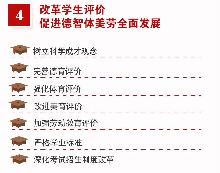 4.堅持把立德樹人成效作為根本標(biāo)準。加快完善各級各類學(xué)校評價標(biāo)準,將落實黨的全面領(lǐng)導(dǎo)、堅持正確辦學(xué)方向、加強和改進學(xué)校黨的建設(shè)以及黨建帶團建隊建、做好思想政治工作和意識形態(tài)工作、依法治校辦學(xué)、維護安全穩(wěn)定作為評價學(xué)校及其領(lǐng)導(dǎo)人員、管理人員的重要內(nèi)容,健全學(xué)校內(nèi)部質(zhì)量保障制度,堅決克服重智育輕德育、重分數(shù)輕素質(zhì)等片面辦學(xué)行為,促進學(xué)生身心健康、全面發(fā)展。