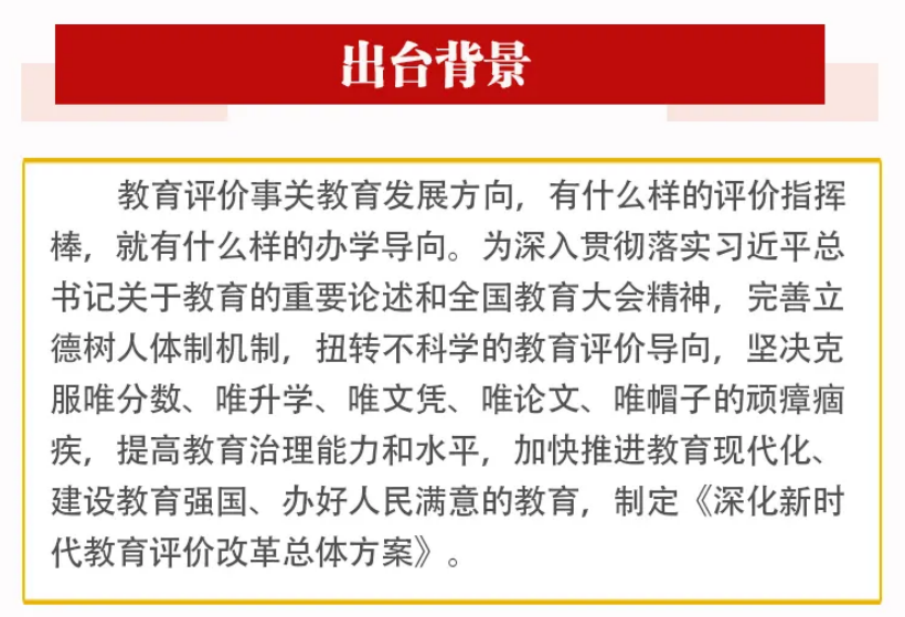 教育評價事關(guān)教育發(fā)展方向,有什么樣的評價指揮棒,就有什么樣的辦學(xué)導(dǎo)向。為深入貫徹落實習(xí)近平總書記關(guān)于教育的重要論述和全國教育大會精神,完善立德樹人體制機制,扭轉(zhuǎn)不科學(xué)的教育評價導(dǎo)向,堅決克服唯分數(shù)、唯升學(xué)、唯文憑、唯論文、唯帽子的頑瘴痼疾,提高教育治理能力和水平,加快推進教育現(xiàn)代化、建設(shè)教育強國、辦好人民滿意的教育,現(xiàn)制定如下方案。