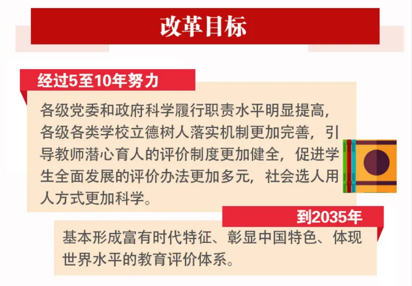 (三)改革目標(biāo)。經(jīng)過5至10年努力,各級黨委和政府科學(xué)履行職責(zé)水平明顯提高,各級各類學(xué)校立德樹人落實機制更加完善,引導(dǎo)教師潛心育人的評價制度更加健全,促進學(xué)生全面發(fā)展的評價辦法更加多元,社會選人用人方式更加科學(xué)。到2035年,基本形成富有時代特征、彰顯中國特色、體現(xiàn)世界水平的教育評價體系。