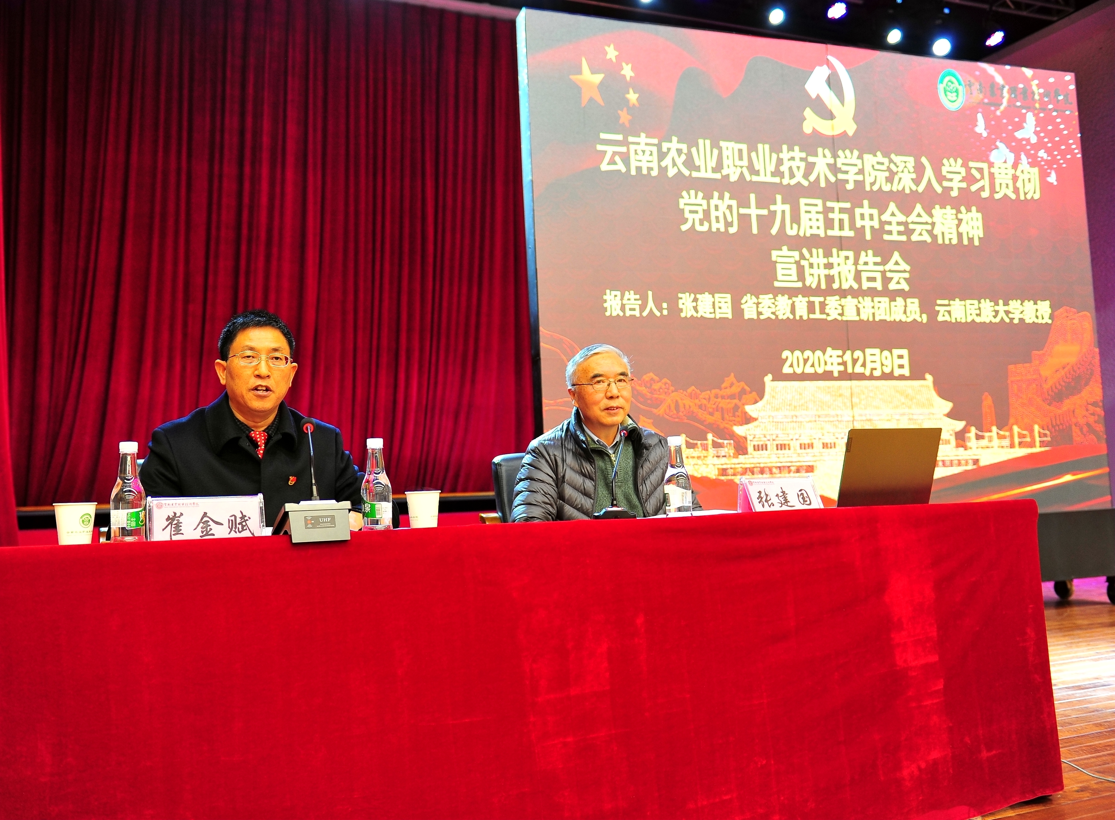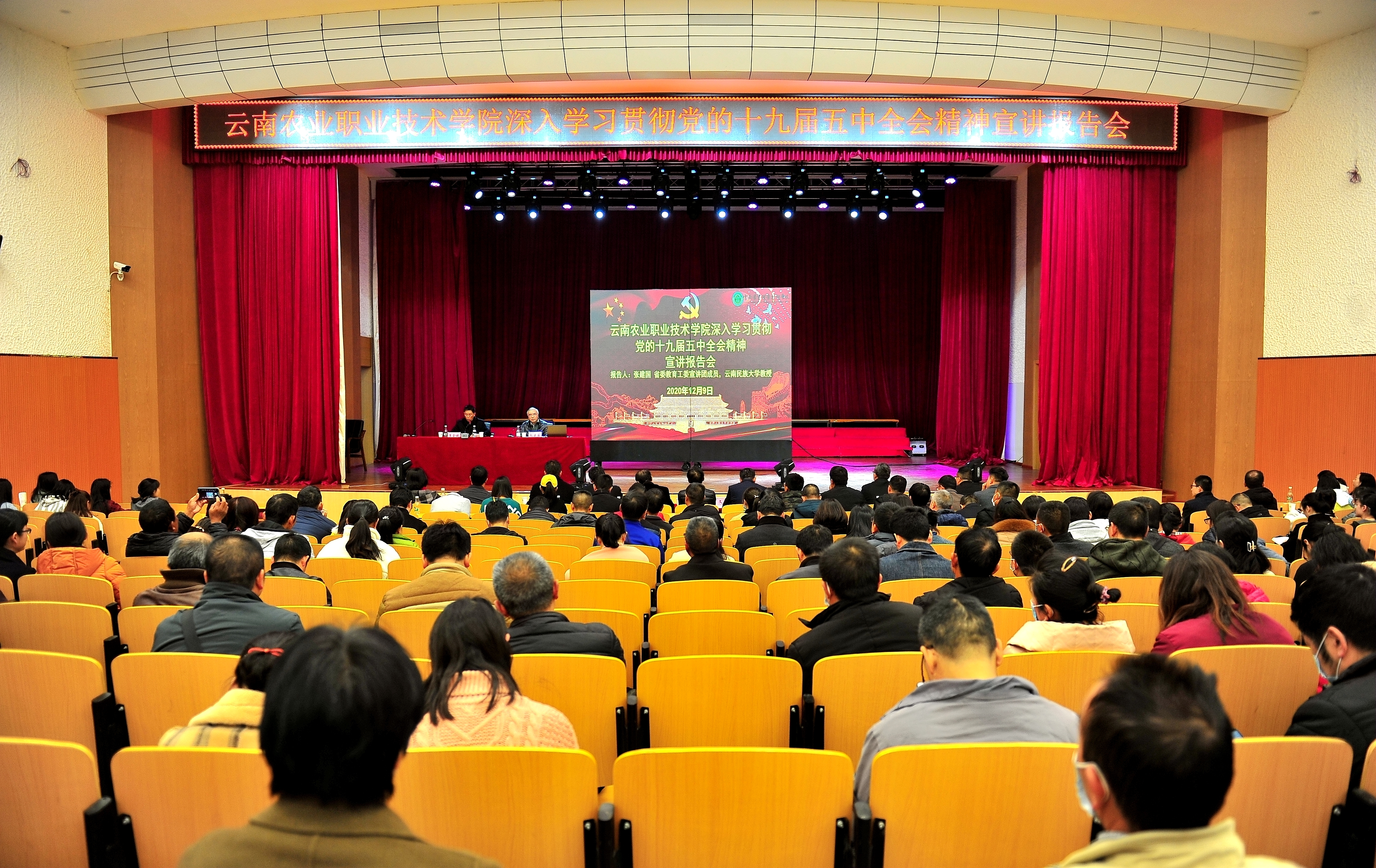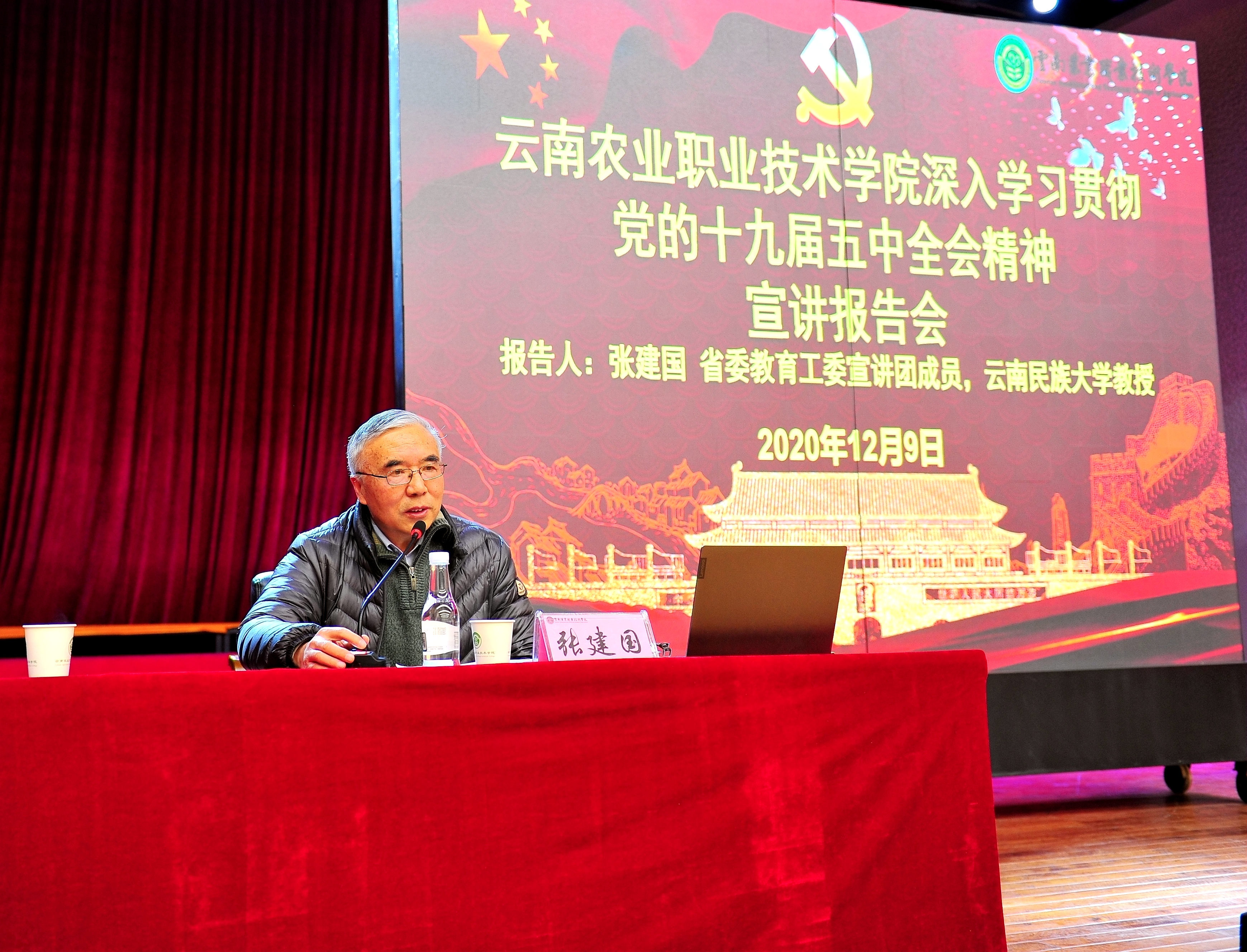 12月9日下午,我院在小哨校區蠶桑禮堂召開深入學習貫徹黨的十九屆五中全會精神宣講報告會。省委教育工委宣講團成員、中央馬克思主義理論研究和建設工程高校思想政治理論課教材編寫課題組首席專家、云南民族大學馬克思主義學院張建國教授應邀作宣講報告。黨委書記崔金賦同志;黨委副書記、院長文俊同志;黨委委員、紀委書記馮志宏同志;黨委委員、副院長雷衡同志;黨委委員、副院長蘇華偉同志;黨委委員、馬克思主義學院黨總支書記張建才同志;黨委委員、組織部、統戰部部長王軍明同志;黨委委員、辦公室(黨委巡察辦)主任夏體韜同志;黨建共建合作院校、昆明衛生職院黨委副書記張曉剛同志;黨委委委員、副院長、組織部部長周平同志出席宣講報告會。全體教職工以及青馬班學生約600人;昆明衛生職業學院部分師生代表約20人共同聆聽了報告。學院黨委書記崔金賦同志主持報告會。
