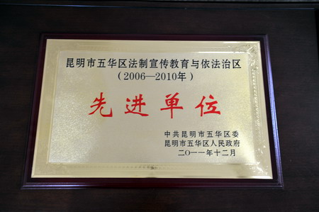 據中共昆明市五華區委《中共昆明市五華區委 昆明市五華區人民政府關于表彰五華區法制宣傳教育與依法治區(2006-2010年)先進單位、先進集體和先進個人的決定》(五發【2011】23號)文件獲悉,昆明市五華區共表彰先進單位50個、先進集體100個、先進個人200個。其中,我院榮獲五華區“五五”法制宣傳教育與依法治區(2006-2010年)連續四年先進單位榮譽稱號。