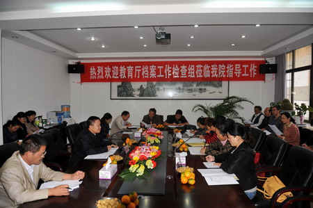 彭志遠院長致歡迎辭。黨委(院長)辦公室主任凌軍向教育廳檢查組匯報學院檔案管理工作。凌軍主任介紹了學院的光輝歷史及發展現狀,重點匯報了我院檔案工作的情況:一是提高思想認識重視檔案工作,二是健全規章制度規范業務工作,三是加強硬件建設創造物質條件,四是強化服務意識提高利用水平,五是針對存在問題切實加以整改。