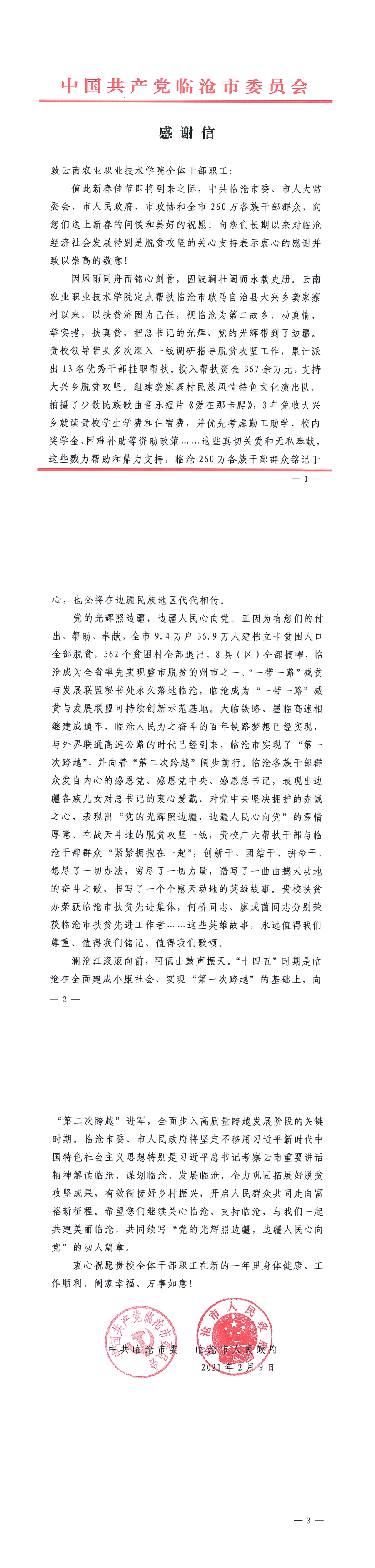 通知中心牛年新春來臨之際,一封滿載臨滄市委、市政府和干部群眾深情厚誼的感謝信翩然而至。脫貧攻堅路上風雨同舟的歲月令人難忘,脫貧攻堅來之不易的成果令人振奮。感謝2015年以來,學院15名駐村工作隊員肩負光榮的職責和使命,舍“小”家、顧“大“家,在距離昆明600多公里的臨滄市大興鄉龔家寨村默默付出和辛勤工作。臨滄人民的真誠感謝和殷殷期盼,讓我們奮進的腳步更加堅定。學院將堅定不移貫徹黨中央決策部署,充分發揮好高等職業教育在脫貧攻堅戰中的重要作用,為臨滄市鞏固拓展脫貧攻堅成果同鄉村振興有效銜接作出應有的貢獻。(黨委宣傳部/文/圖:唐麗群/審核:楊筱瑩/責任編輯:普仲凱)