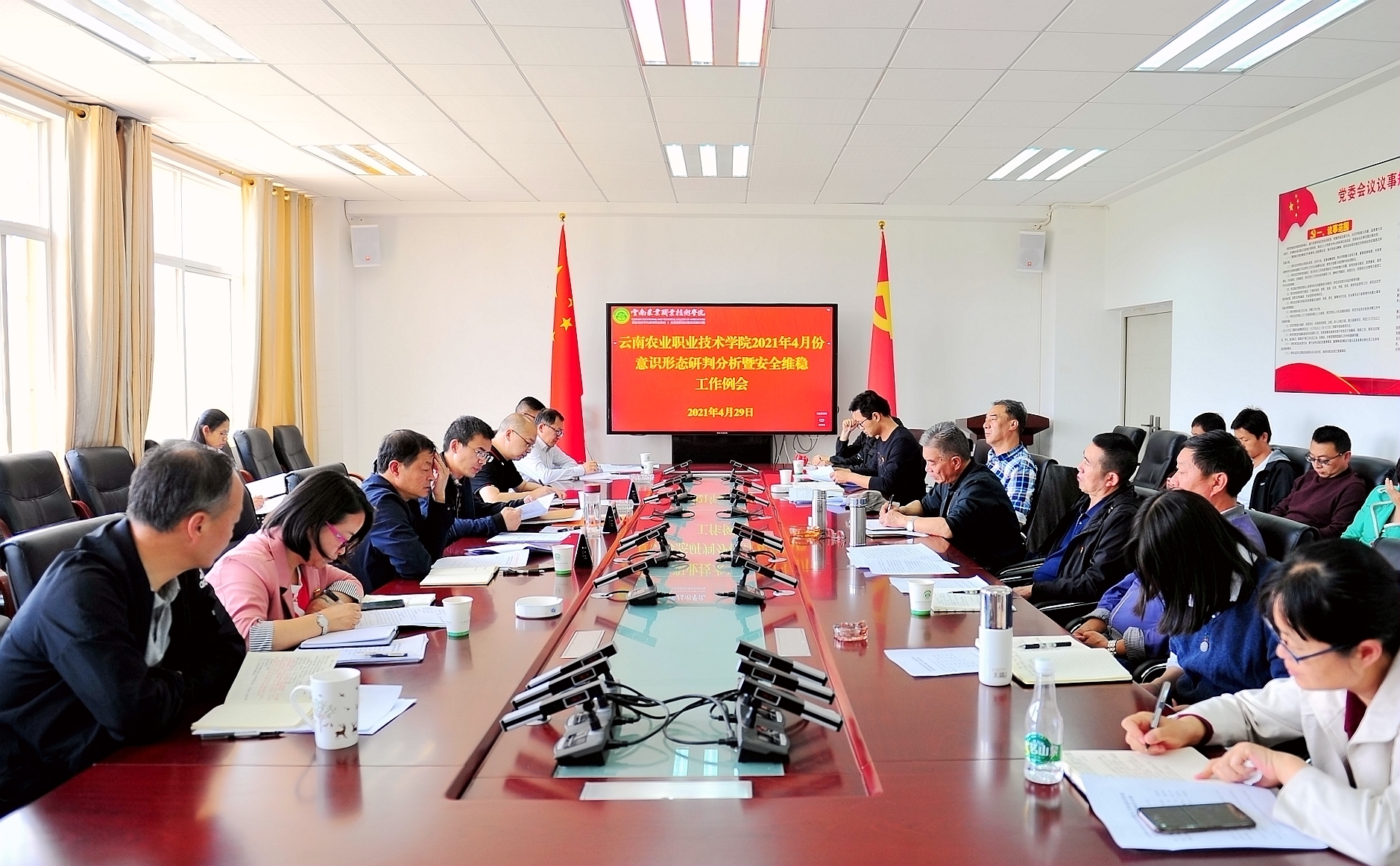 通知中心4月29日下午,學院在小哨校區綜合樓421會議室召開4月份意識形態研判分析暨安全維穩工作例會。學院黨委副書記伍學龍、副院長楊波、雷衡出席會議,會議由副院長雷衡主持。學院各有關部門負責人、各二級學院負責人參加會議。